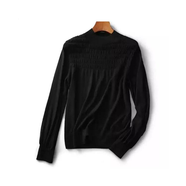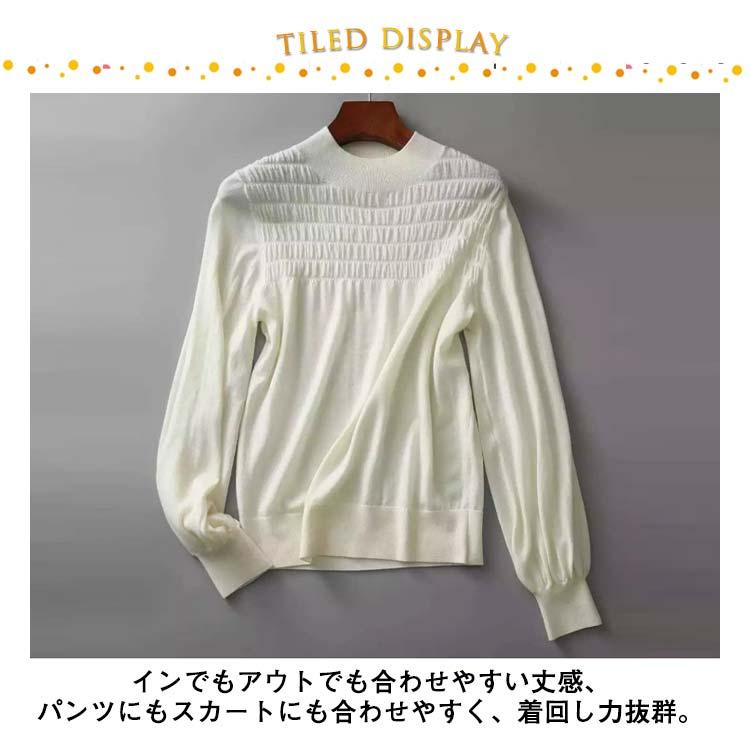 大人気 胸元くしゅくしゅデザインがおしゃれ パフスリーブ ニット セーター レディース ぽわん袖 薄手 ニットトップス 長袖 モックネック ハイネック 無地