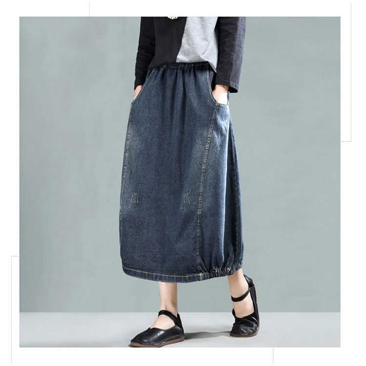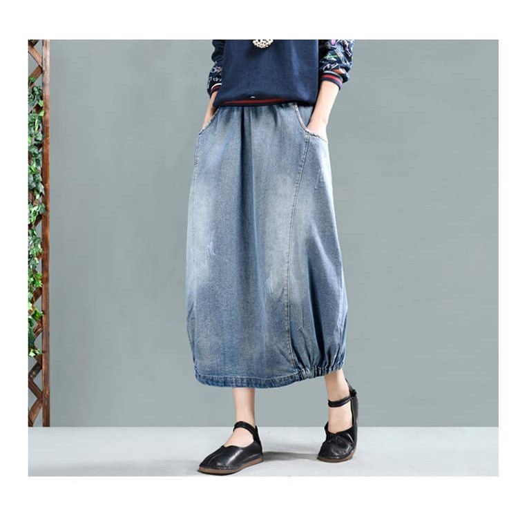 デニムスカート バルーンスカート レディース ミモレ丈 ロング丈 裾ゴムロングスカート ハイウエス