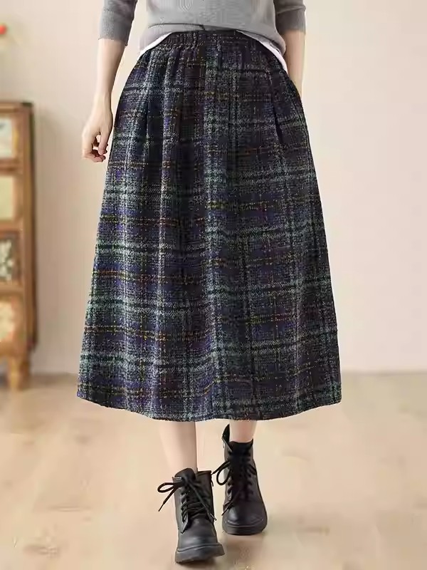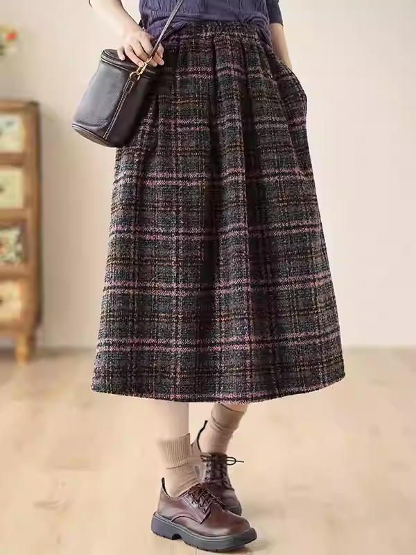 日本風 レトロ ツイード チェック スカート レディース 高級な質感 秋冬 新作 ゆったり ハイウエスト スリム 気質 ミディ丈 Aラインスカート