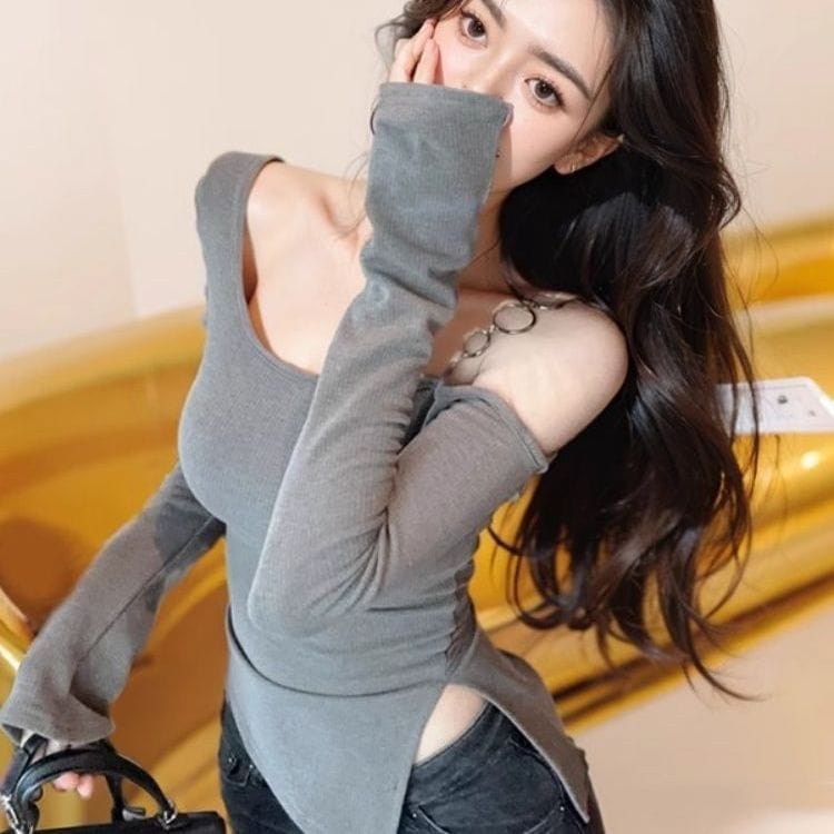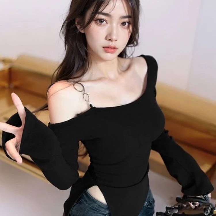 オフショルダーセクシートップスアシンメトリー甘辛Tシャツスプリットデザイン春秋新作レイヤード用 ユニークなオフショルダーフィット感ある長袖