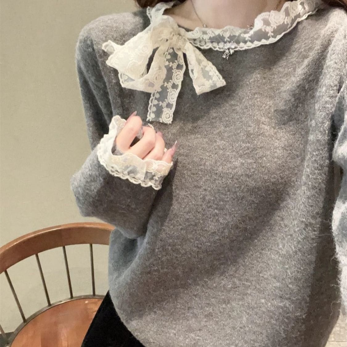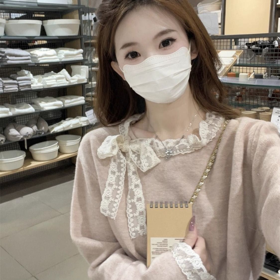 甘いレースリボン付きインナーシャツレディース春秋新作優し韓国風シルエットスリム効果のあるロングスリーブインナー