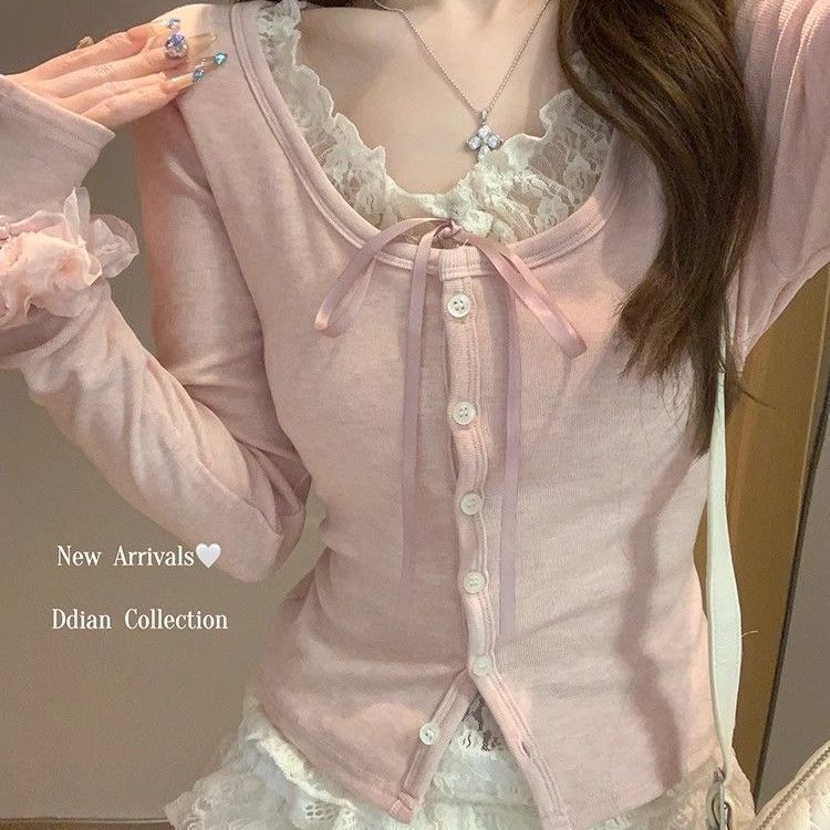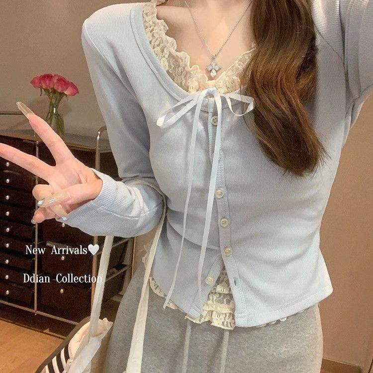 純粋でセクシーなレースパッチワークTシャツ春秋新作細身スリム効果偽ツーピース長袖インナートップス レディース