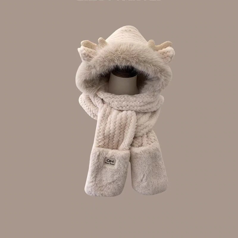角付き 3点セット 秋冬季 帽子 女性用手袋 マフラー一体 可愛い 合わせやすい 保温 裏地付き厚手 ふわふわ帽子