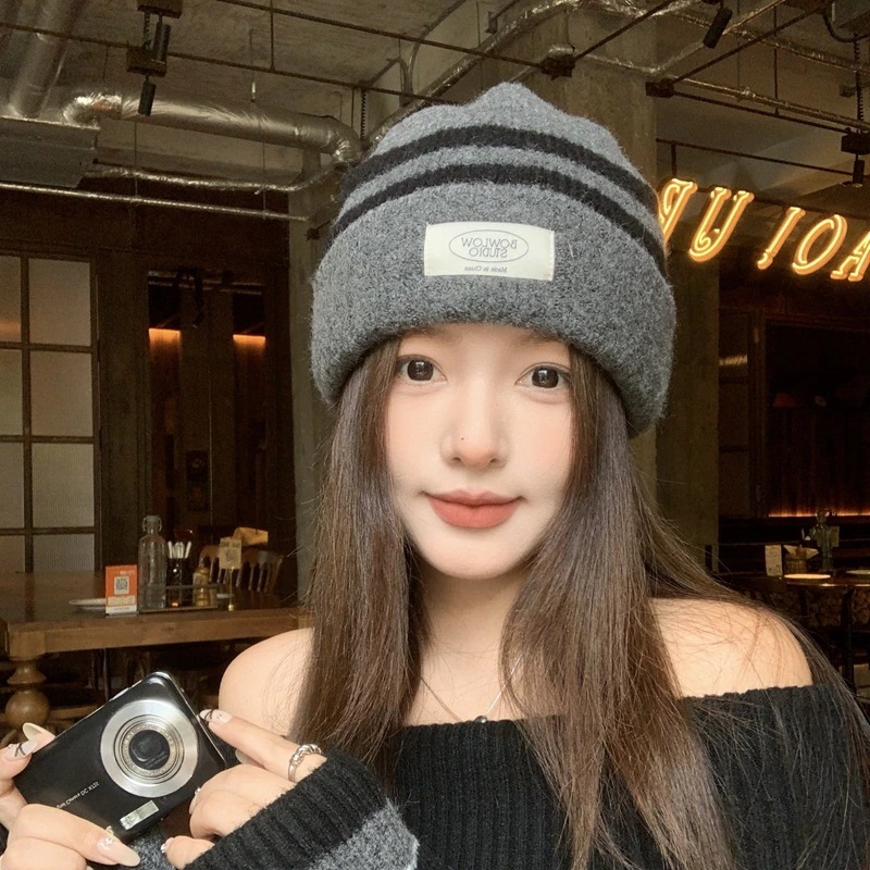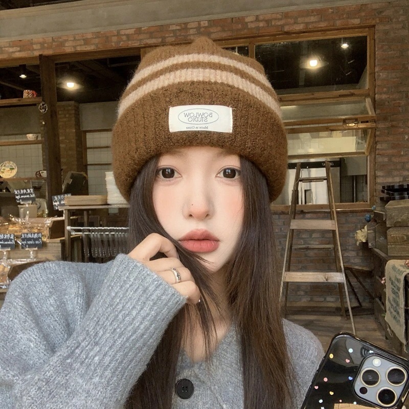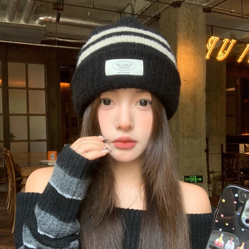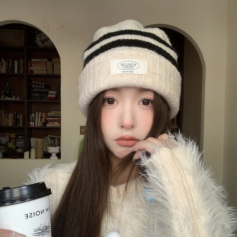 韓国風 ストライプニット帽 女性 秋冬 保温 冷気対策 シンプル 小顔効果 毛糸帽子