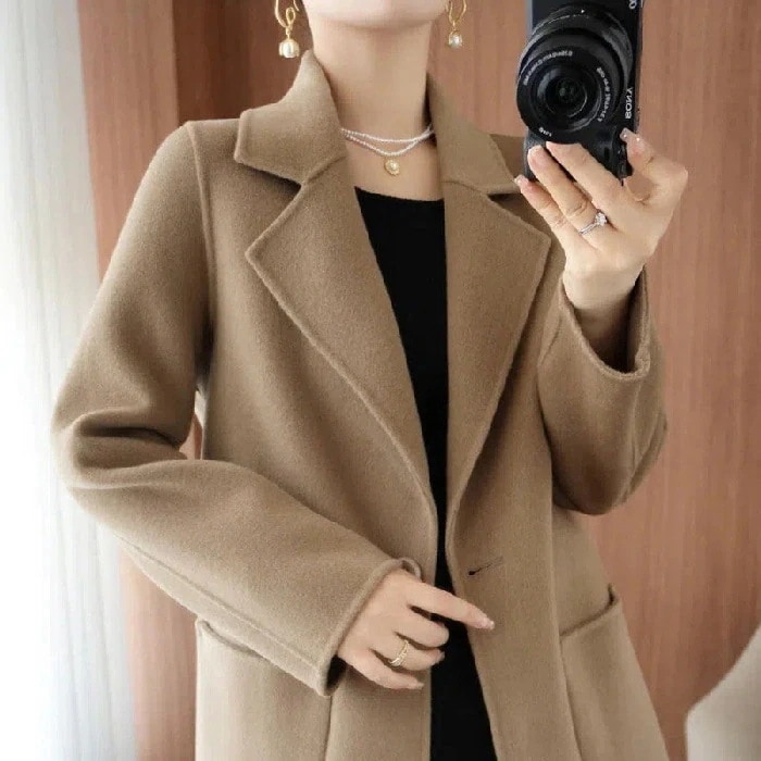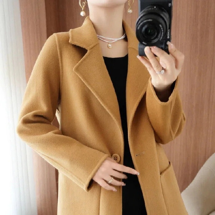 2025 秋冬新作 レディースカシミアリバーシブルウールコート ミドルロングボタン付き 小柄体型ウールブレンド外套トレンド