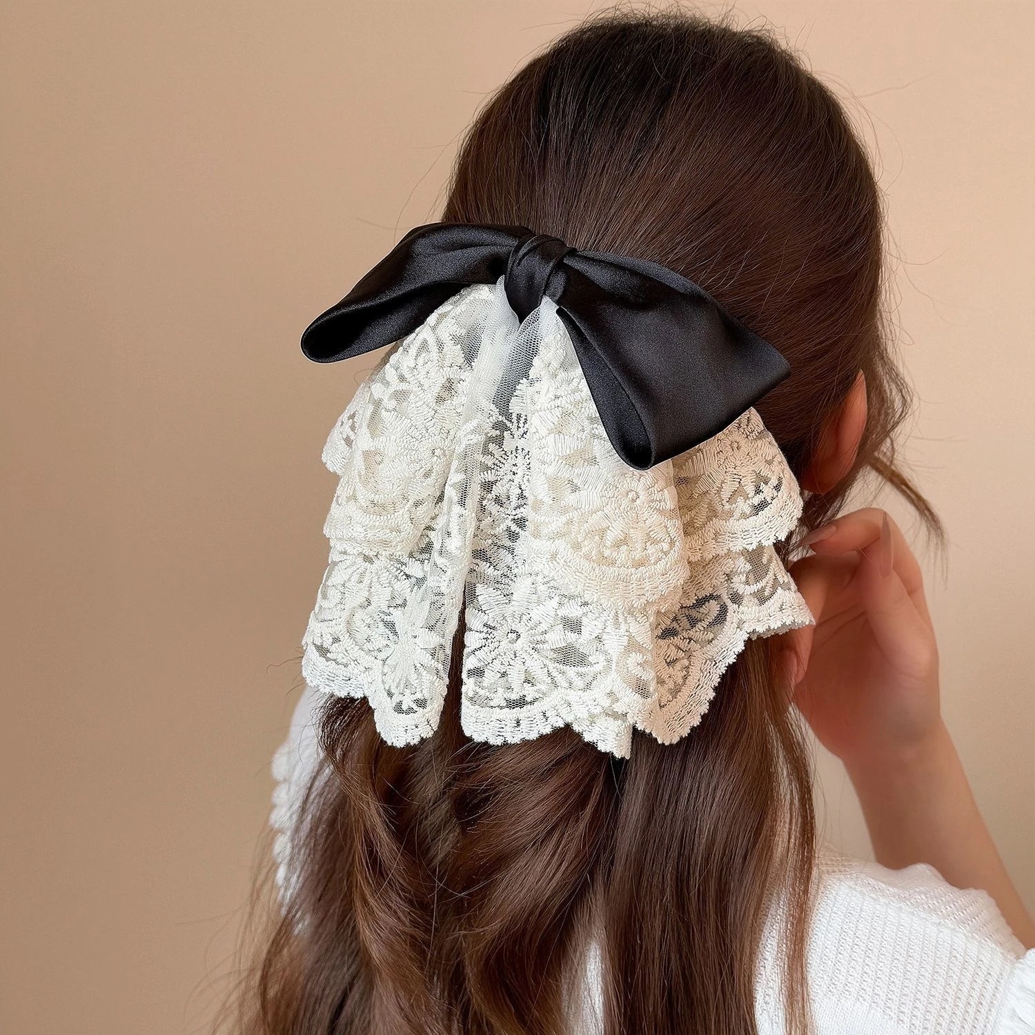 ボヘミアンフレンチレースリボンポニーテールクリップ後頭部ヘアクリップ女性用