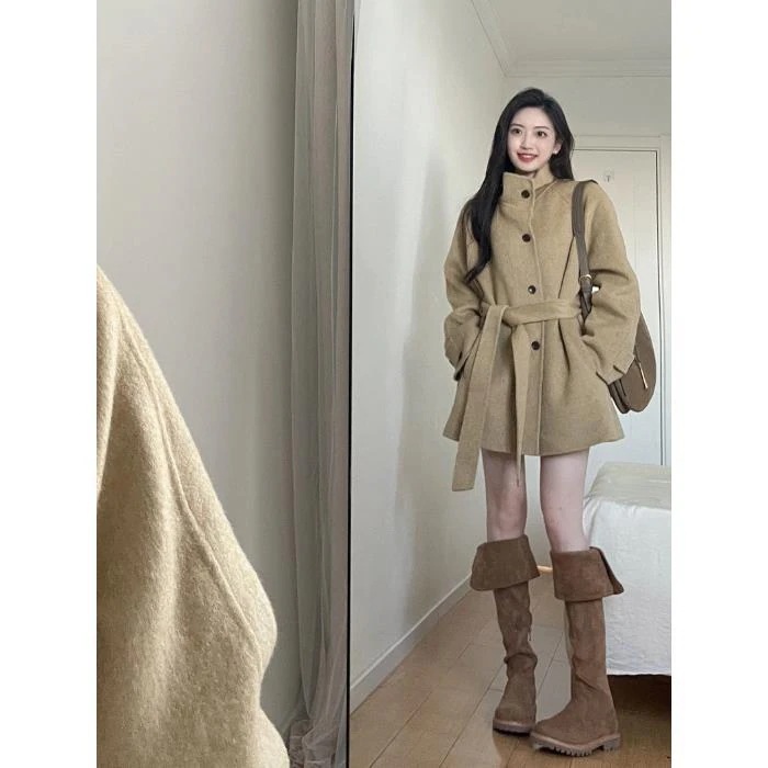 人気アウター 高級感ヘボン風カーキ毛織物コート秋冬新作小柄コートミディアム丈