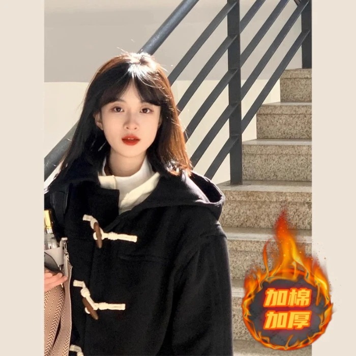 人気アウター 牛角ボタンブラックウールコートレディース秋冬新作ミディアム丈キャミソールコートを厚めに