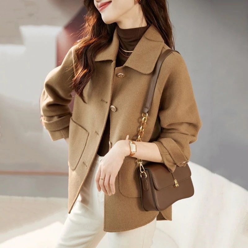 人気アウター 秋冬の新作ファッション韓国版痩せた気質を見せる純色シングルブレスト短い毛のコート女