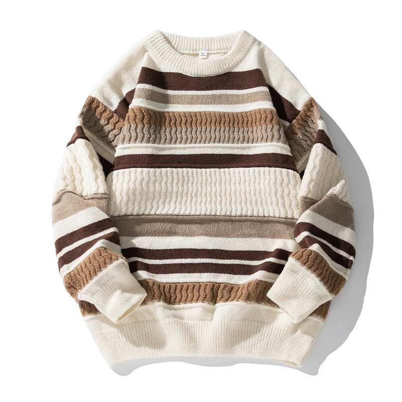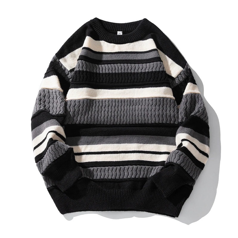 日系ラウンドネックセーター男性秋冬新作ストライプカラーブロックパッチワークトレンドカップルゆったりニットジャケット