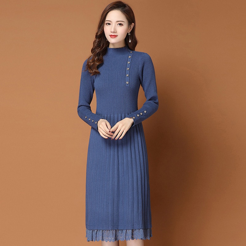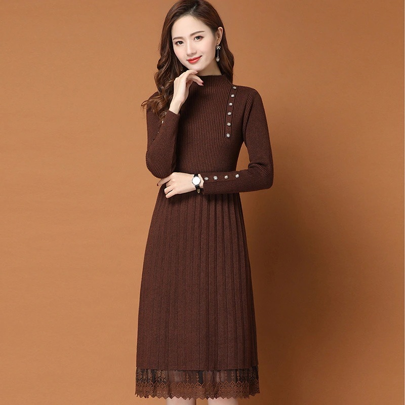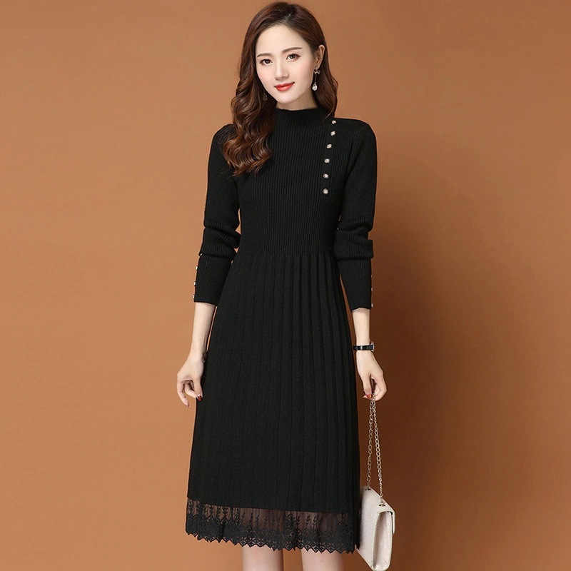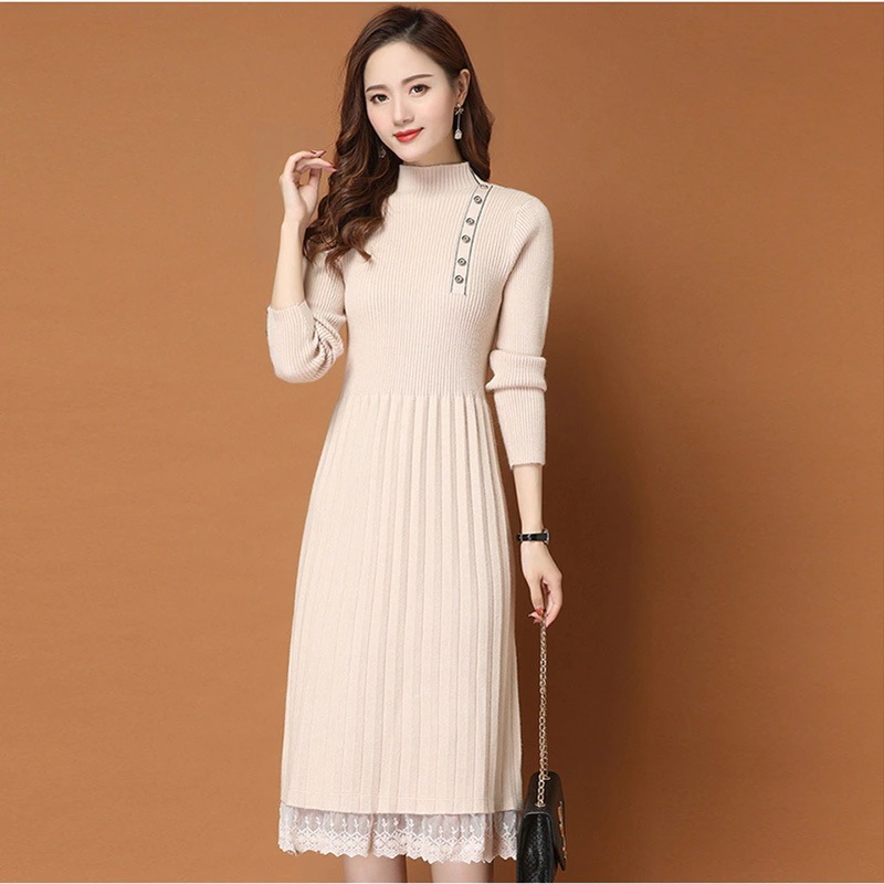 ニット ワンピース レディース レディース ハーフタートルネック 膝下 コート 合わせ レース ニット ボトムス ニット ワンピース