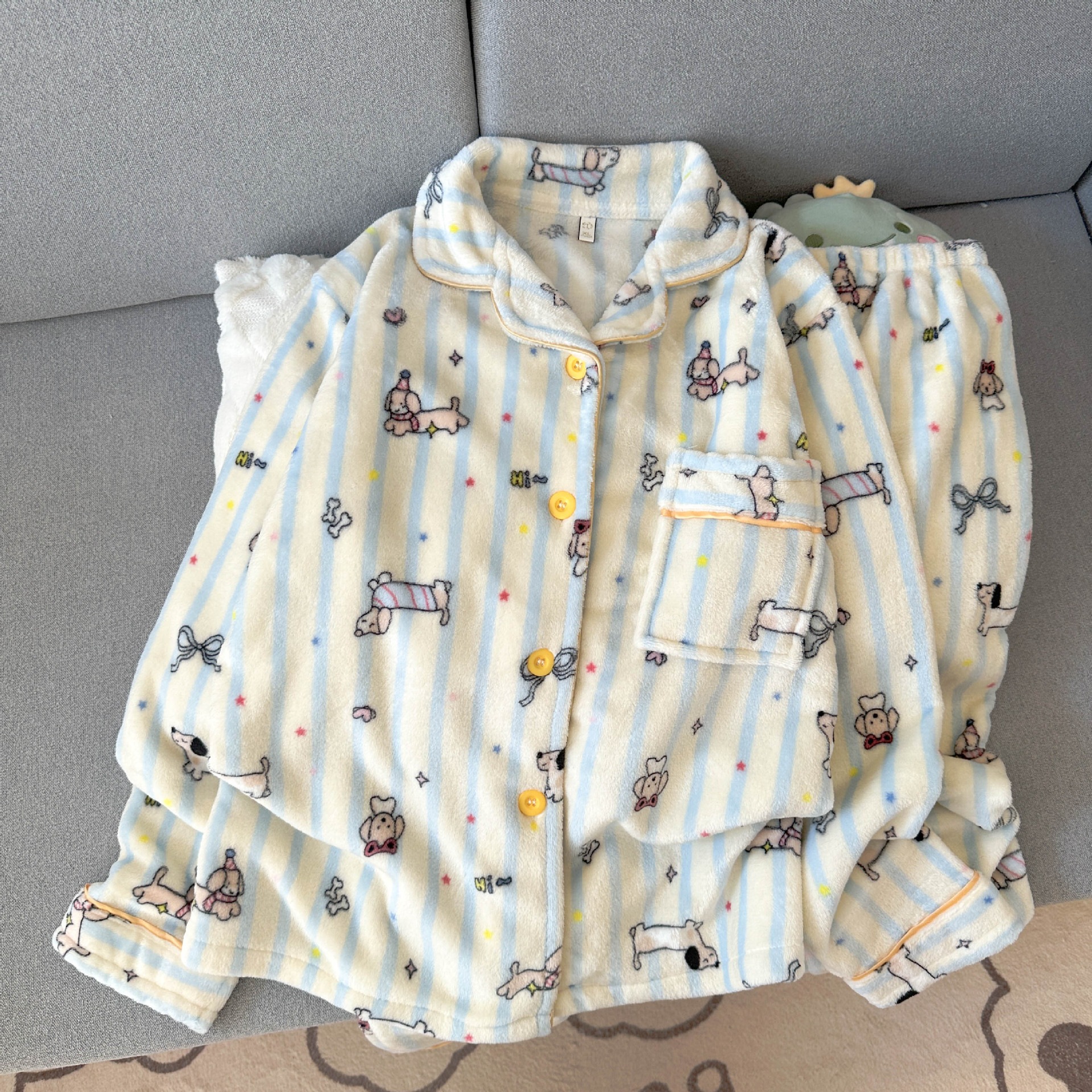 秋冬用ダックスフンド コーラルフリース 長袖パジャマ - 女の子向けの甘くてキュートで暖かい漫画風ホームウェアセット