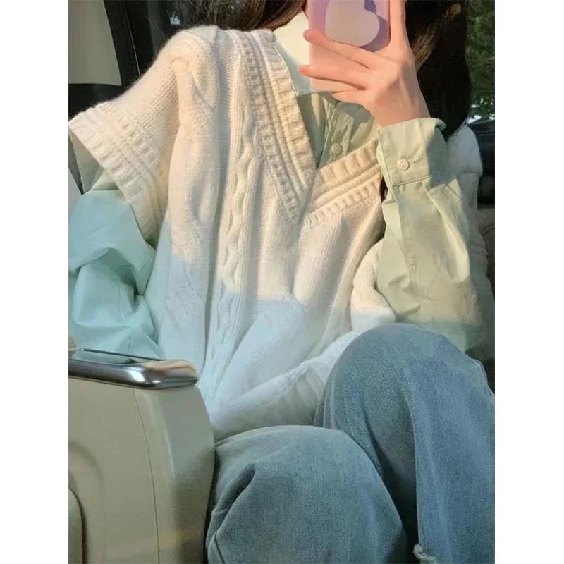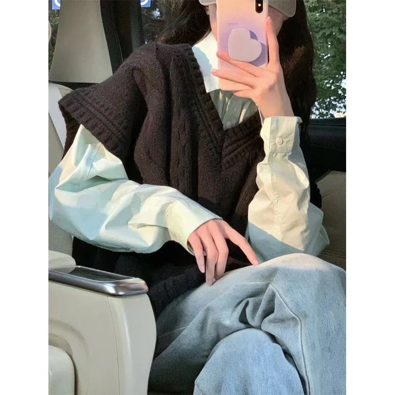2点セットシングルカレッジスタイルミントグリーンシャツ和風レイジースタイルレイヤードニットベストベスト女性用