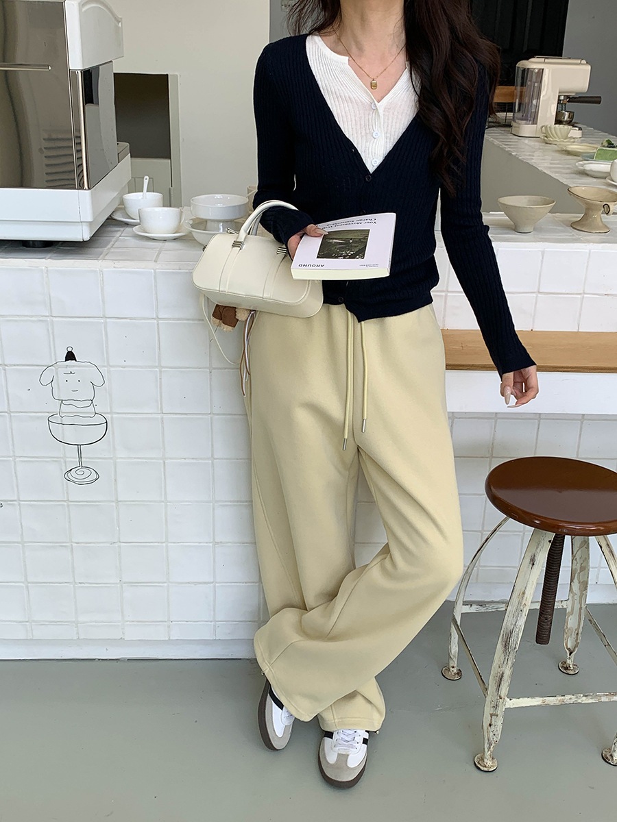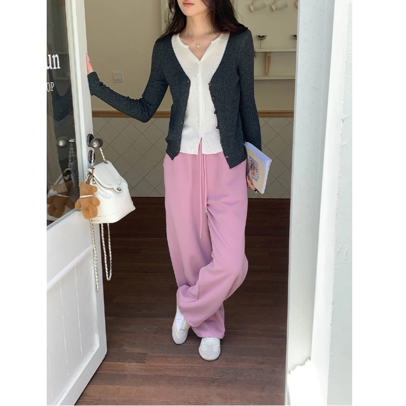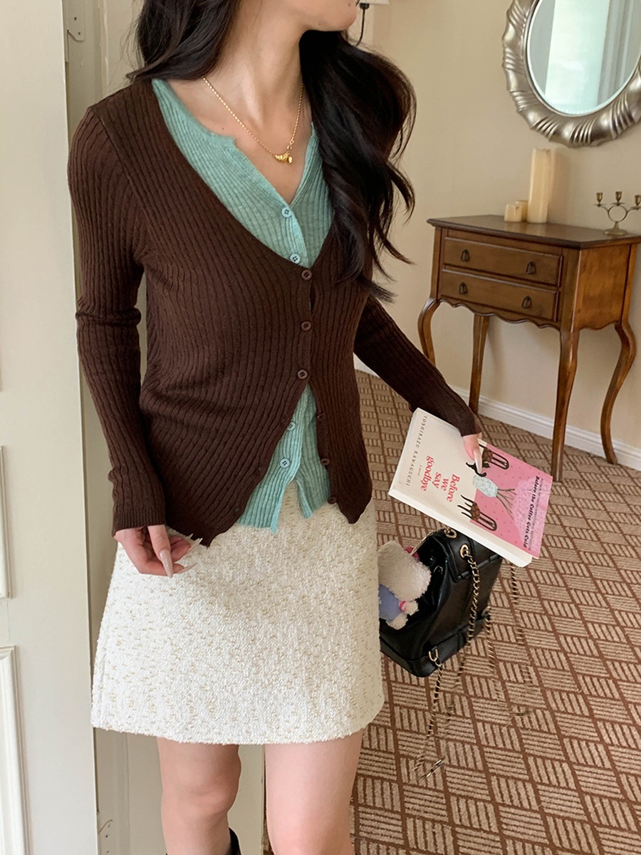 重ね着のレイヤード感 カラーブロック風2ピース風Vネックスリムニットカーディガン