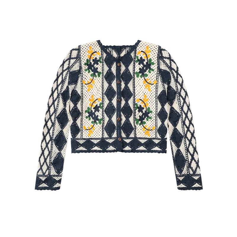エスニック風アウター 透かし編みレースカーディガン女性長袖 Vネックトップス ニッチで個性的な刺繍春秋用