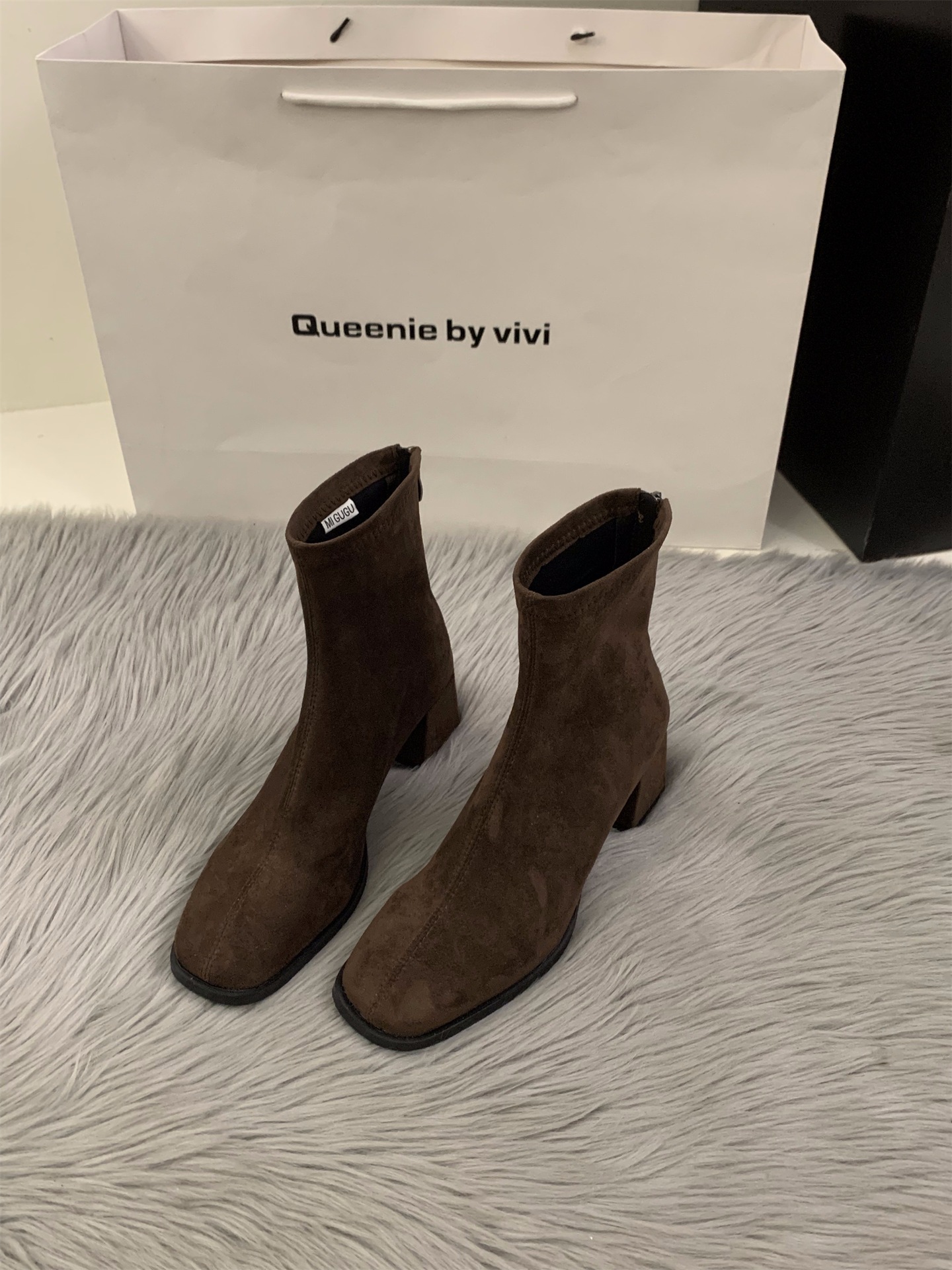 ショートブーツ ハイヒールスクエアヘッドスキニーショートブーツレディースシューズ秋冬韓国小さな足首のブーツマーチンブーツ