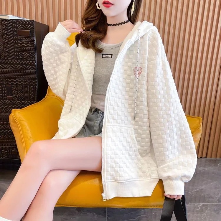 パーカー レディース ジップアップ 春と秋の女性のためのワッファージャケットセンシングジッパーカーディガン薄いゆるいbfレイジースタイルのフード付きスウェットシャツのトレンド