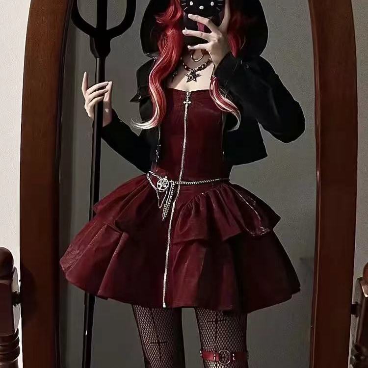 ハロウイン コスプレ レトロ ロリータ 猫耳フード付きショートジャケット ダーク系 細身効果 ストラップドレスセット
