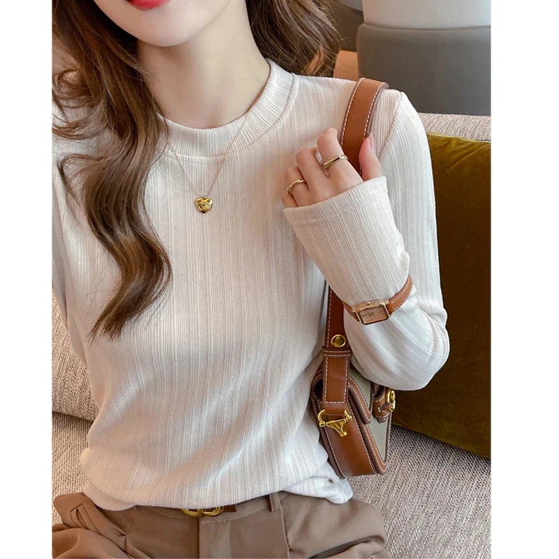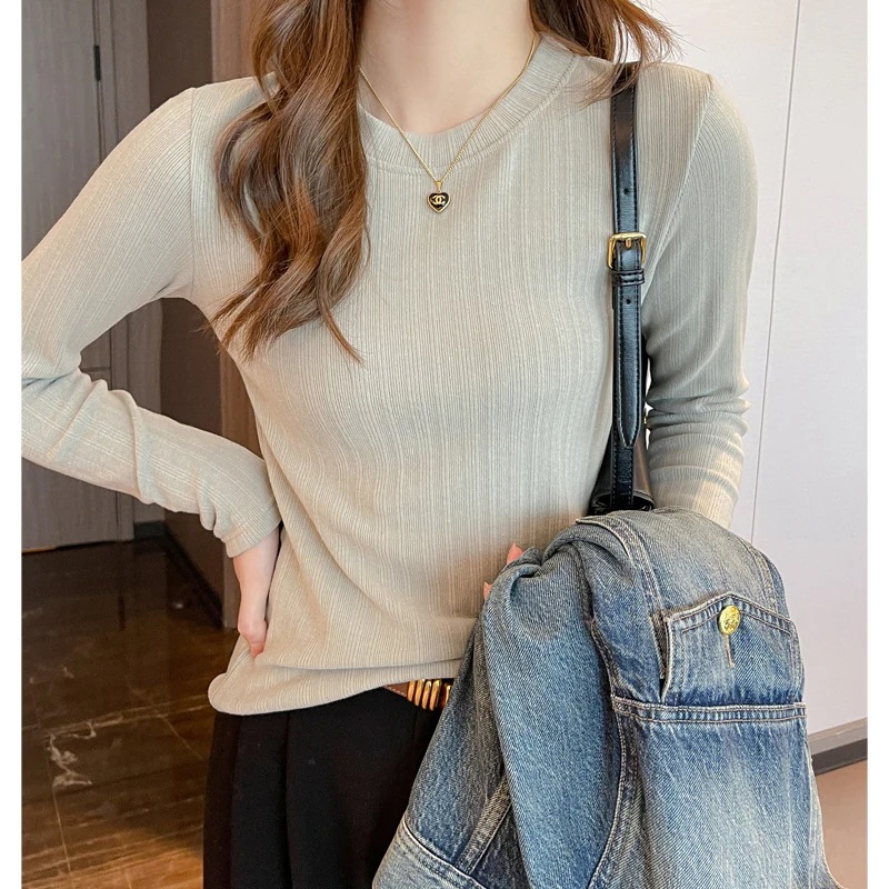 ロンT 秋冬用 丸首 リブ編み 細身効果 長袖 肌着 女性のTシャツ トップス
