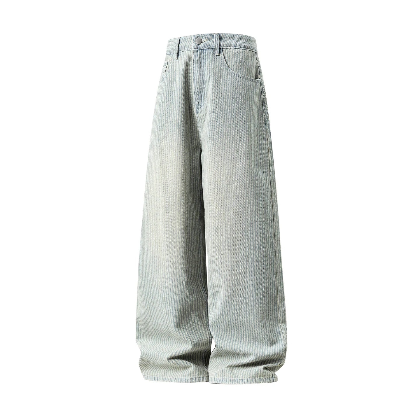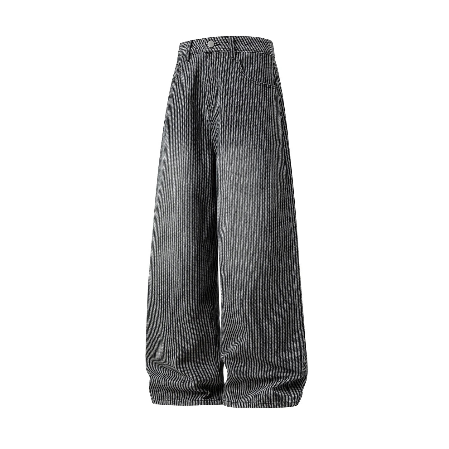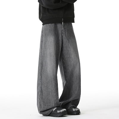 レトロな縦ストライプのウォッシュ加工ヴィンテージ風デニムパンツ男性用秋物ゆったりストレートシルエット万能ロングパンツ