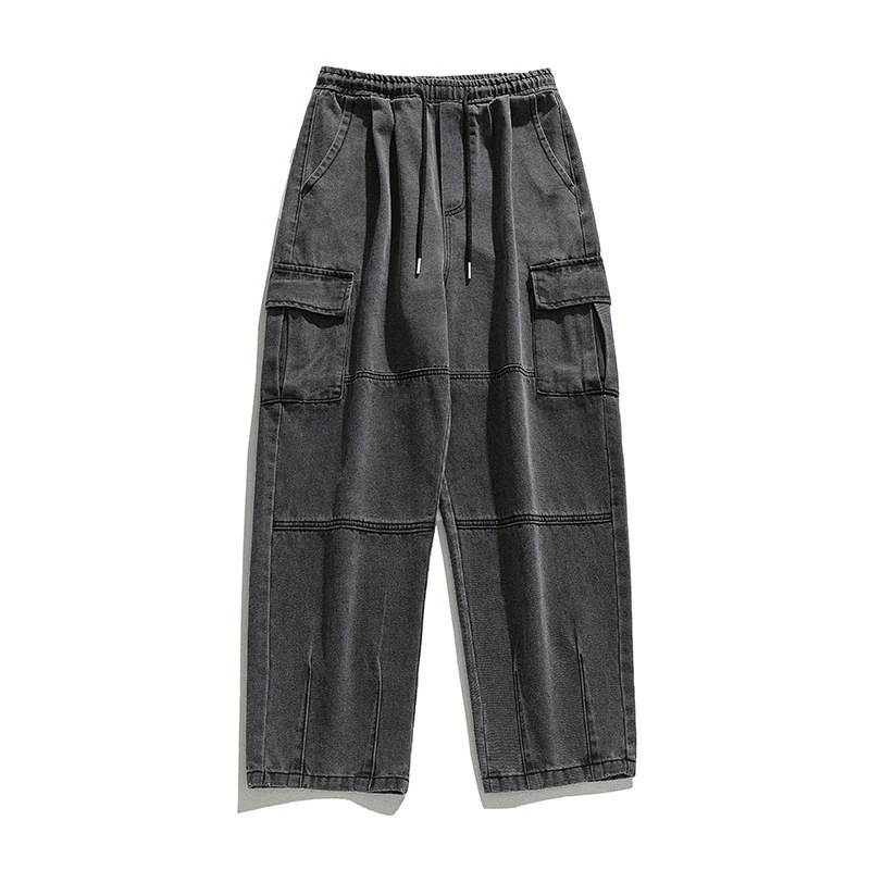 ワークウェア風立体ポケットデザインジーンズ 男性用 春の新作セクション分けパッチワークプリーツ加工ウォッシュ加工日本風ストレートロングパンツ