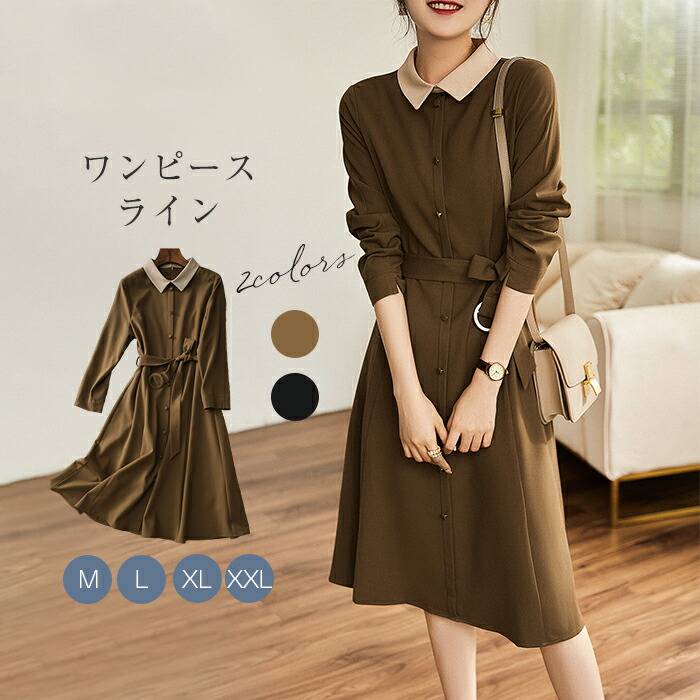 【新作登録】ワンピース 春 きれいめ 長袖 秋冬 ロング レディース シャツワンピース 長袖 おしゃれ フレアワンピース 膝丈 ウエストマーク Aライン エレガント スタンダードカラー 着痩せ フレ