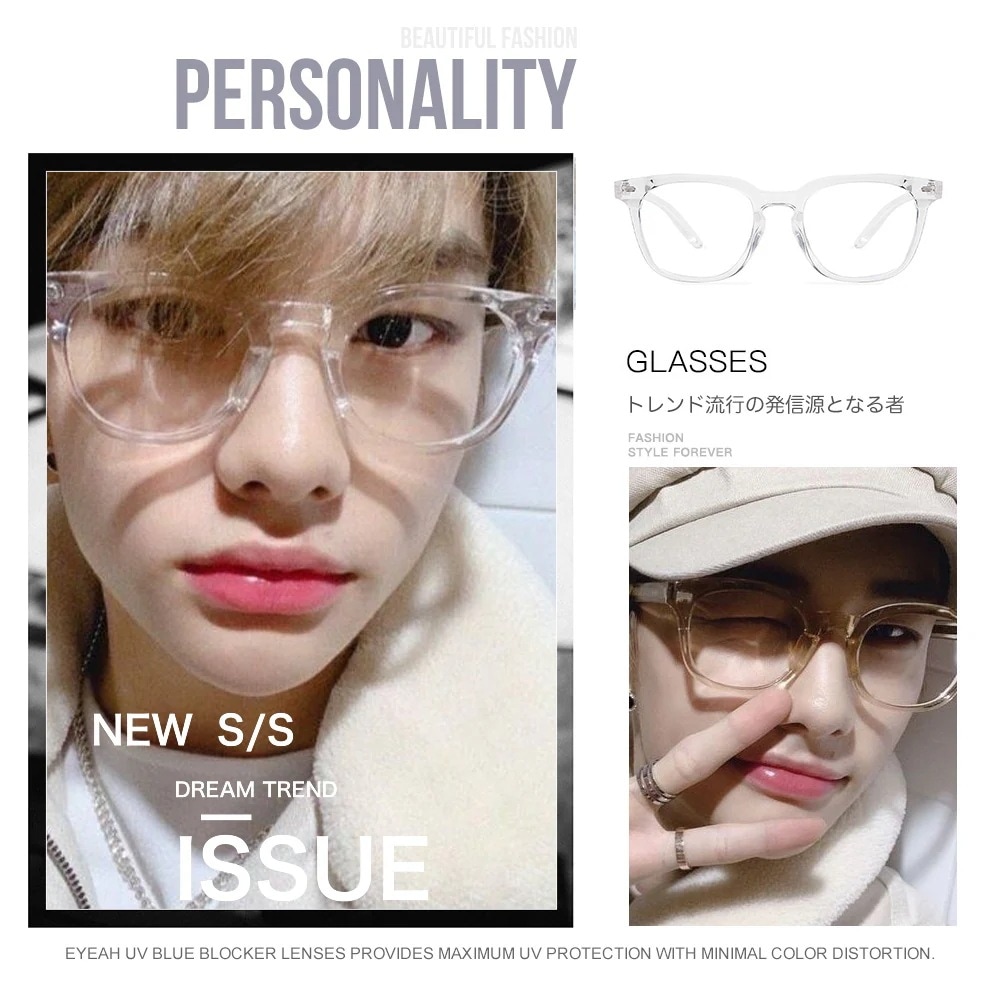 通販 Hyunjin同型!韓国ファッション おしゃれ メガネ 私服着用 StrayKidsファッション ブルーライトカット透明フレームメガネ ヒョンジン