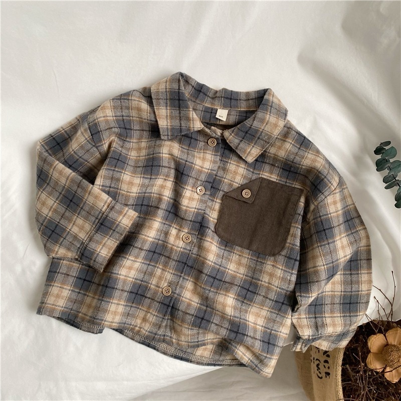 新しい春の子供たちのレトロな格子縞のシャツカーディガンの韓国語版