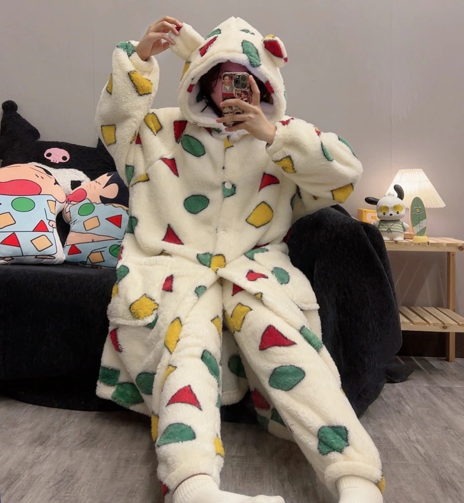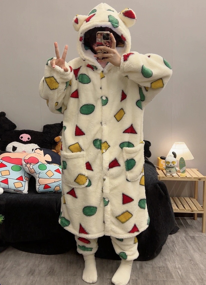 日系クレヨンしんちゃんデザインパジャマ男女兼用秋冬用コーラルフリース裏起毛厚手バスローブ寝間着ホームウェアセット