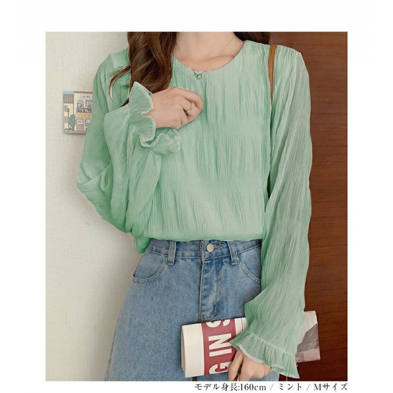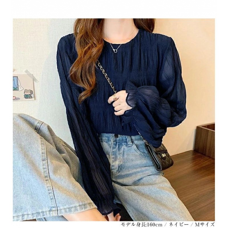 【人気の新作】ブラウス ギャザー トップス 長袖 春服 プルオーバー 夏 裏地付き レディース シャツ ラウンドネック シャーリング 透け感 通勤 シアートップス フリル フレア袖 ボリューム
