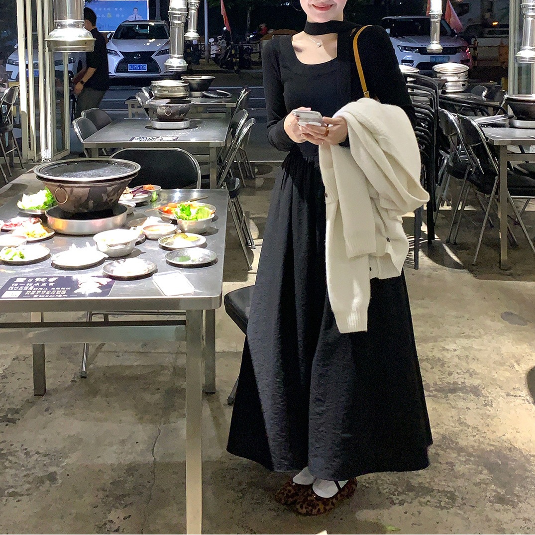 2025ミルククリームピーチ韓国風ホルターネックニット長袖ワンピースレディース優しい風ウエストロングワンピース