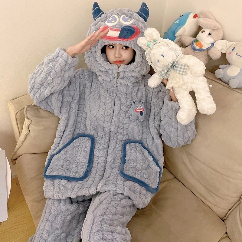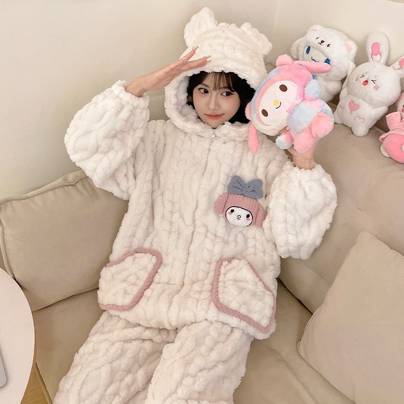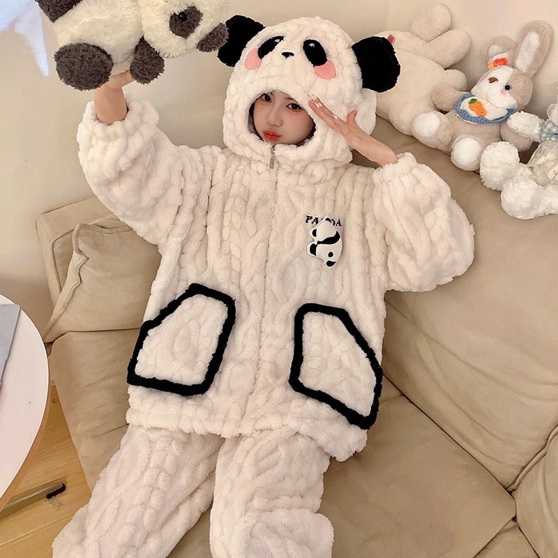 【急速出荷】2025 ルームウェア 秋冬 新作 レディースパジャマ フランネル 厚手 漫画 ホーム フード付き ジップ 冬 セット