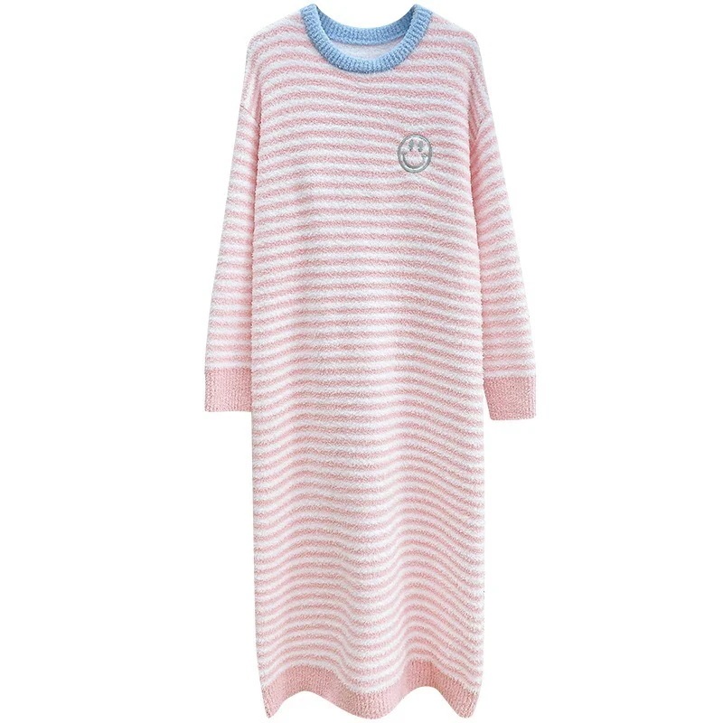 【急速出荷】ルームウェア秋冬新作 スマイリー ナイトガウン レディース 長袖 ロング スウィート ストライプ 爽やか ロングドレス パジャマ ゆったり ホームウェア