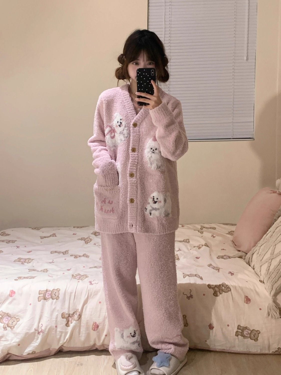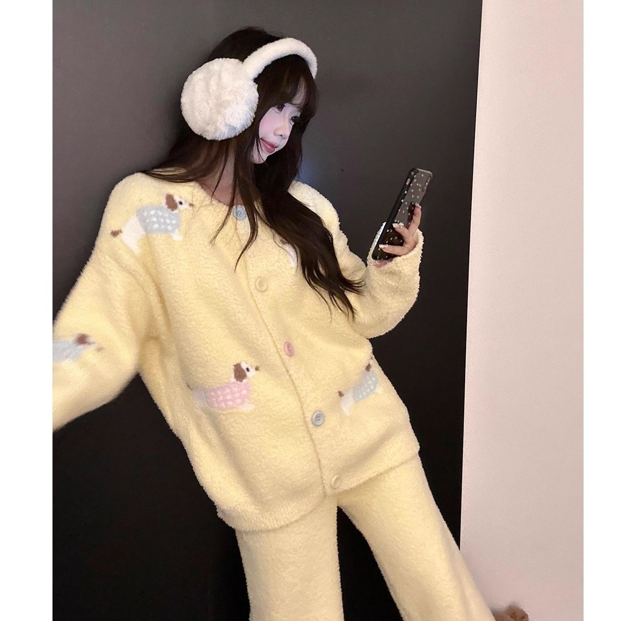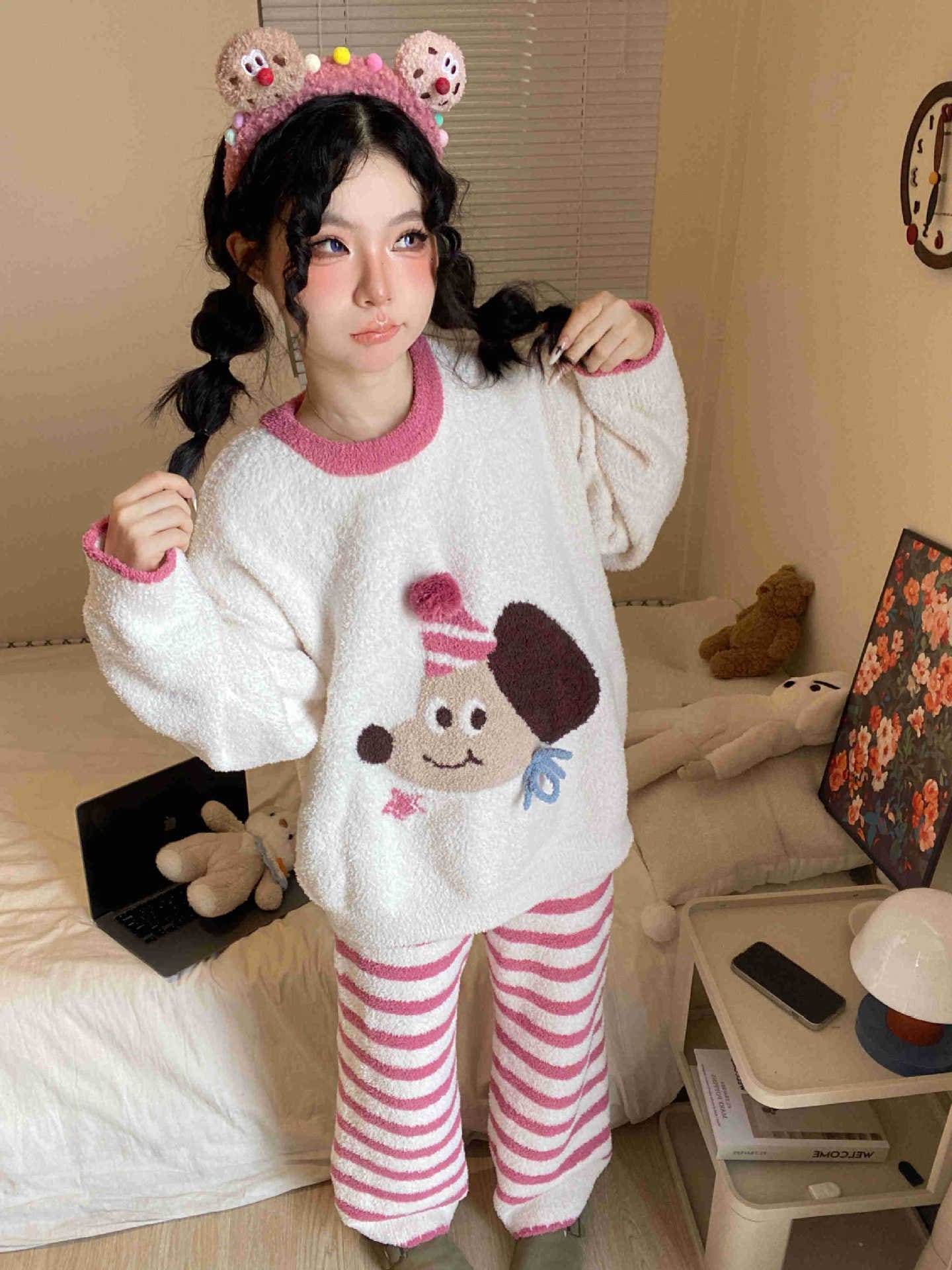 【急速出荷】ルームウェア秋冬新作 レディース キャラクターデザイン ニット素材 ハーフフリース パジャマセット 秋冬 厚手 保温 ホームウェア