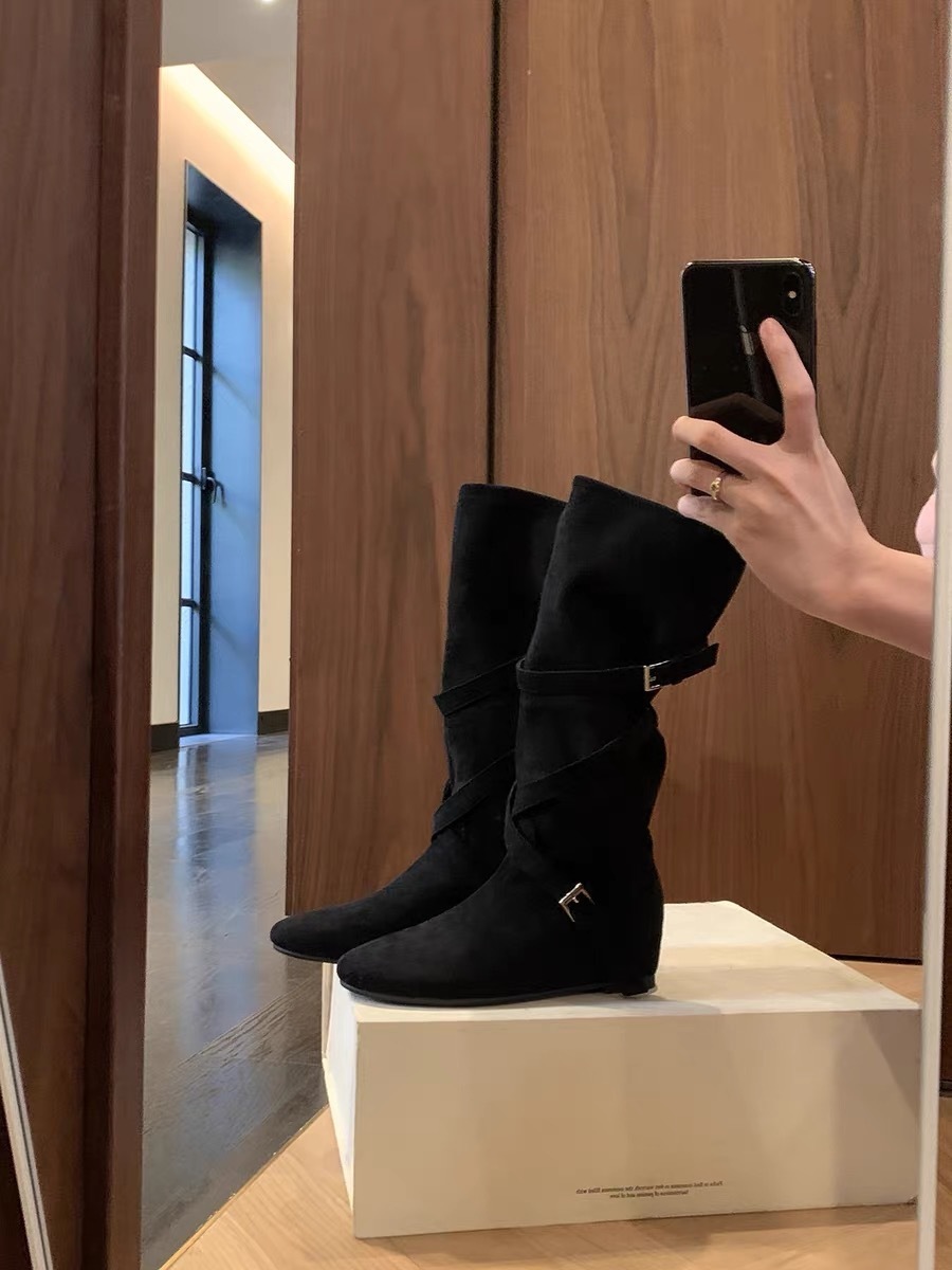 レザーバージョン女性のためのファッショナブルなプリーツスラウチブーツ秋/冬の新しいスタイルラウンドトゥバックルストラップスリムなミッドカーフ乗馬ブーツ6cmの高さの増加
