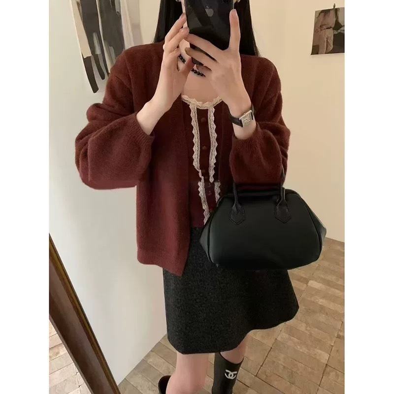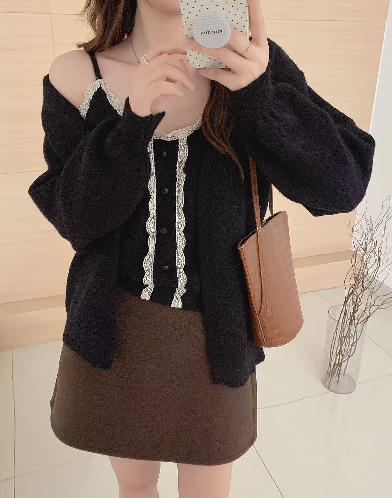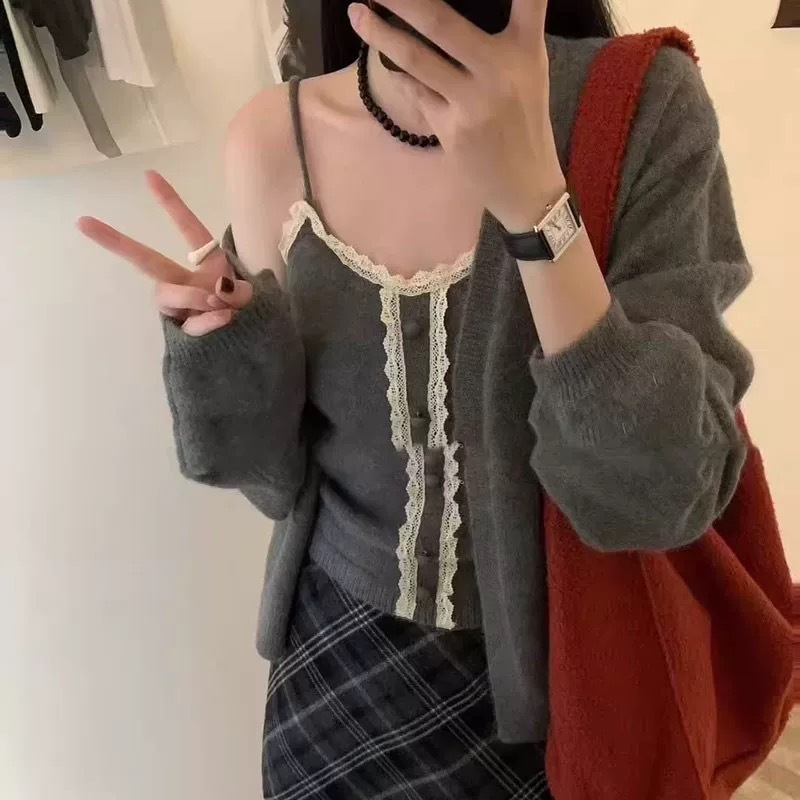 韓国風の万能な無地長袖カーディガンセーターレディース秋冬重ね着レーストリムニットキャミソール2点セット