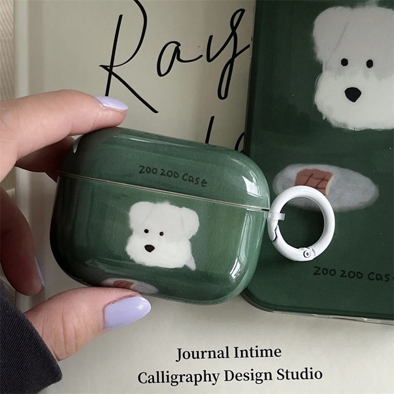 油絵風グリーン犬デザインAirPods Proケース Apple第2/3/4世代ワイヤレスBluetooth保護ケース(女性向けイヤホンケース)