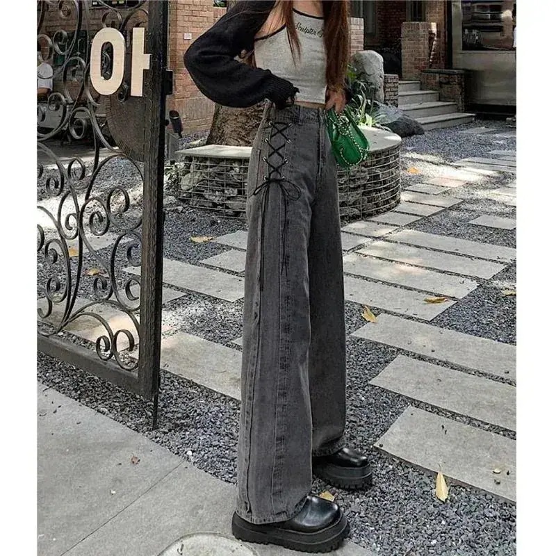 デニムワイドパンツ 新作 スモークグレー バンドジーンズ 着痩せ デニム ゆとりがある ストレートワイドパンツ 韓国ファッション 百掛け やせて見える