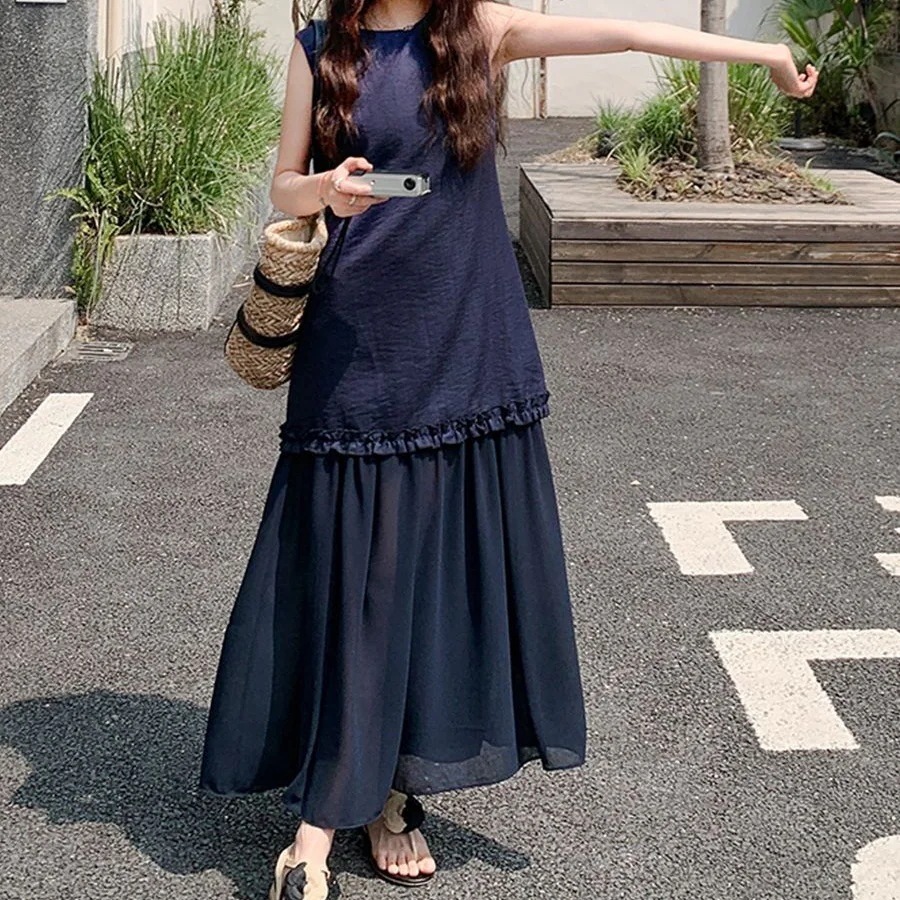 急速出荷優しげな薄手の気品ノースリーブタンクトップロング夏の新作メッシュキルティングデザイン感ワンピース女韓国ファッション