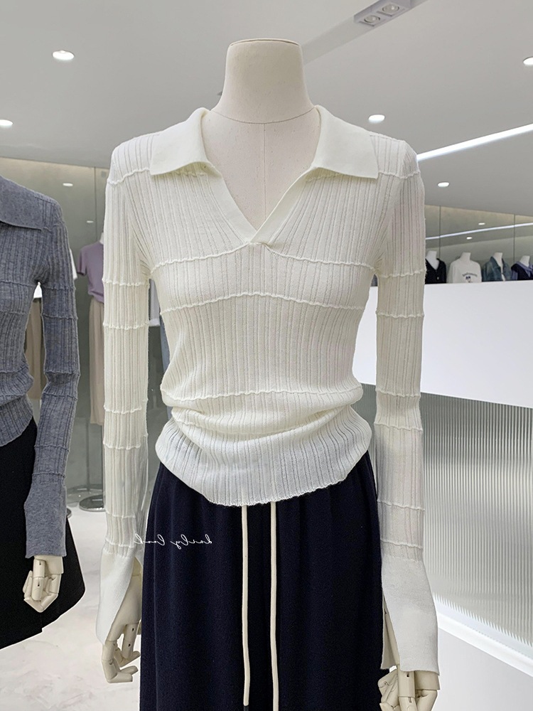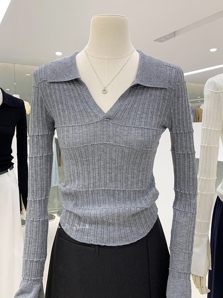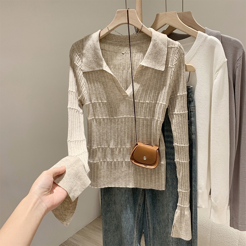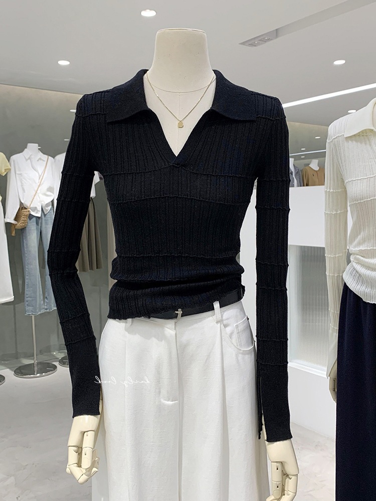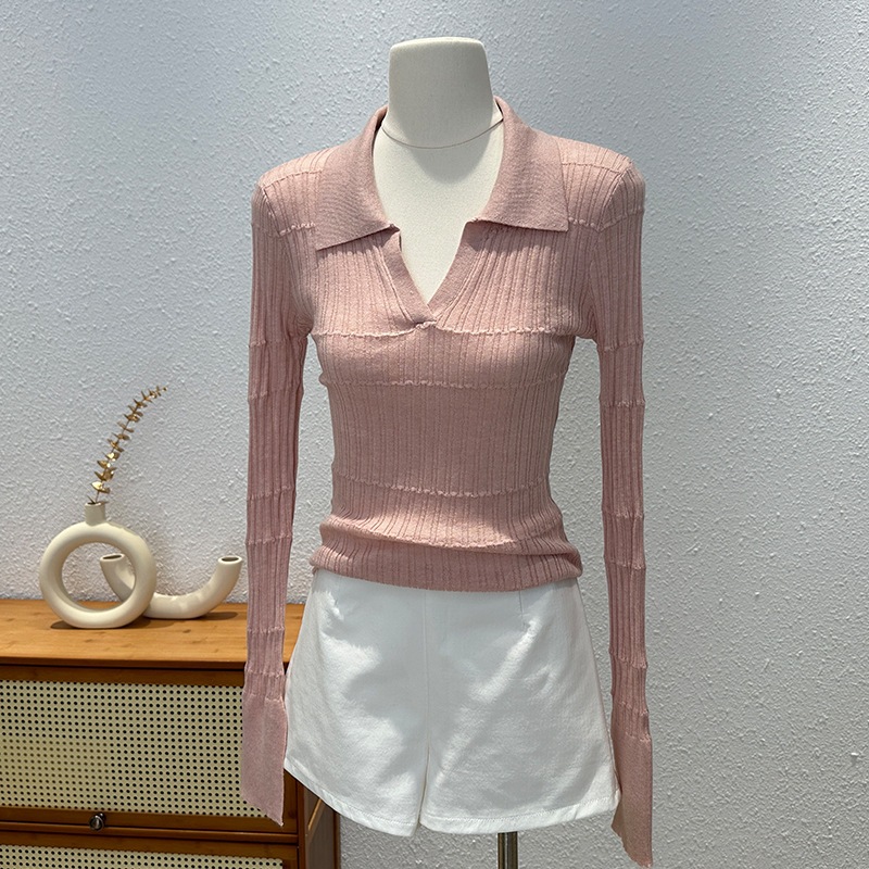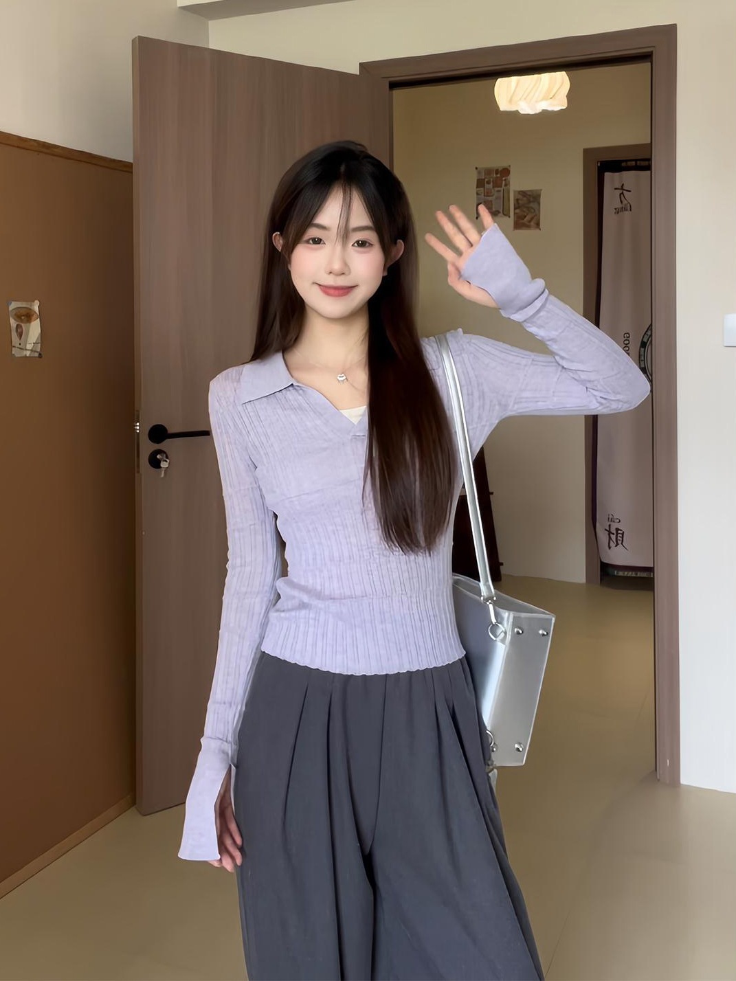 紫色のポロネックニットトップス(女性用)秋用インナーとして着用可能アウターとしても使えるデザイン性のあるニッチなシルエットのスリムフィットベースレイヤー