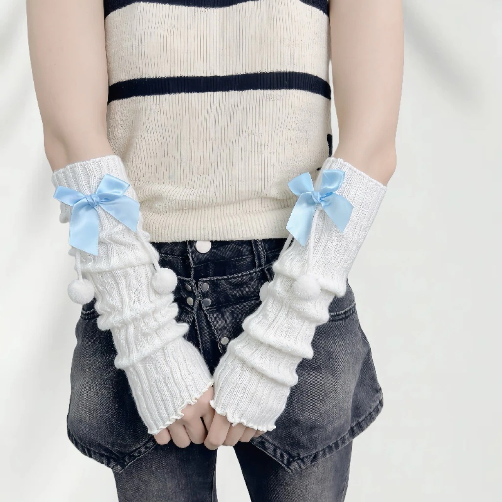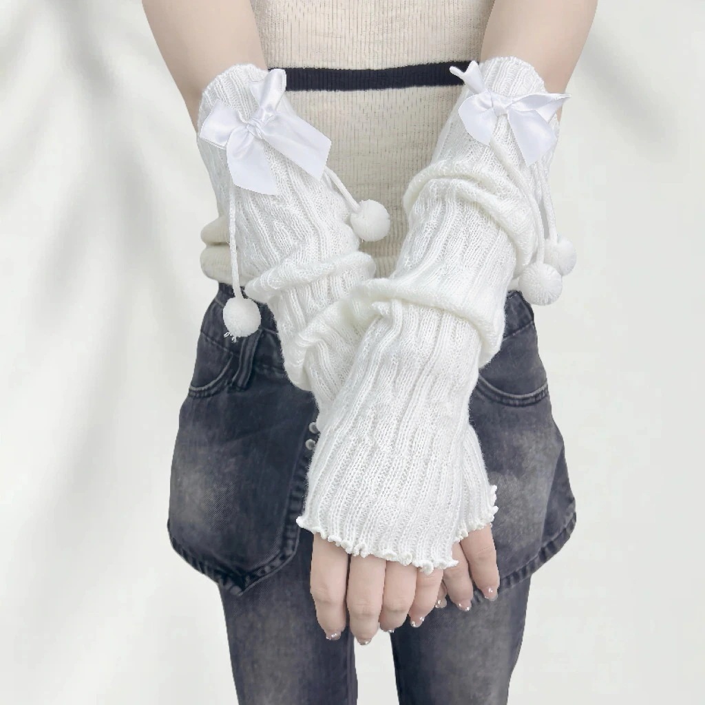 人気 リボン 手袋 越境新年クリスマスギフト 赤ニットアームウォーマー レディース 保温スリーブ キュートな指出し手袋 毛糸