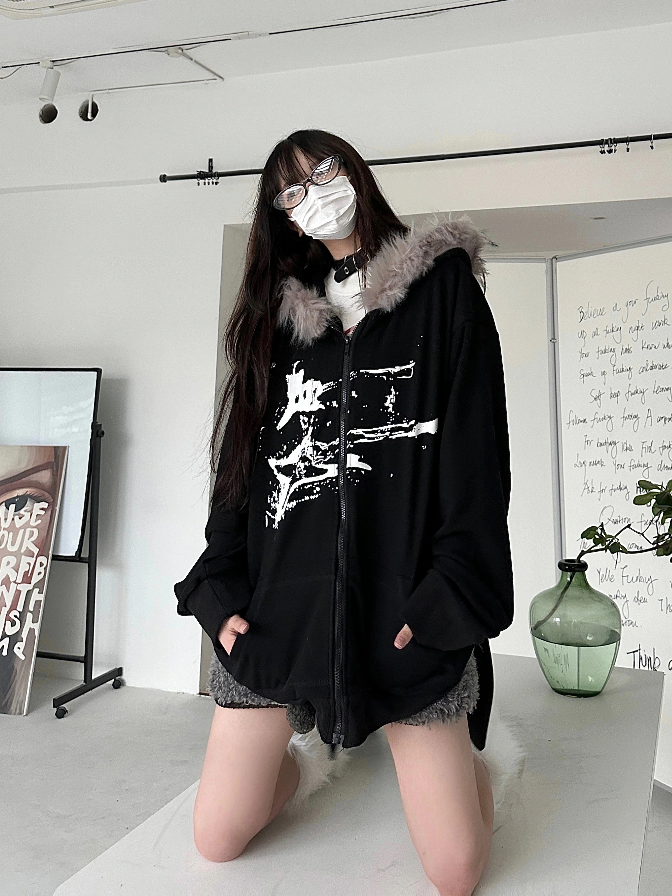 韓国っぽ 2025 ブルゾンフード付きロング丈 長袖トップスカジュアルファッション系フルカラーダコーデ耳トラック 秋冬 アウタートレンド 防寒 かわいい 厚手プリント レディース
