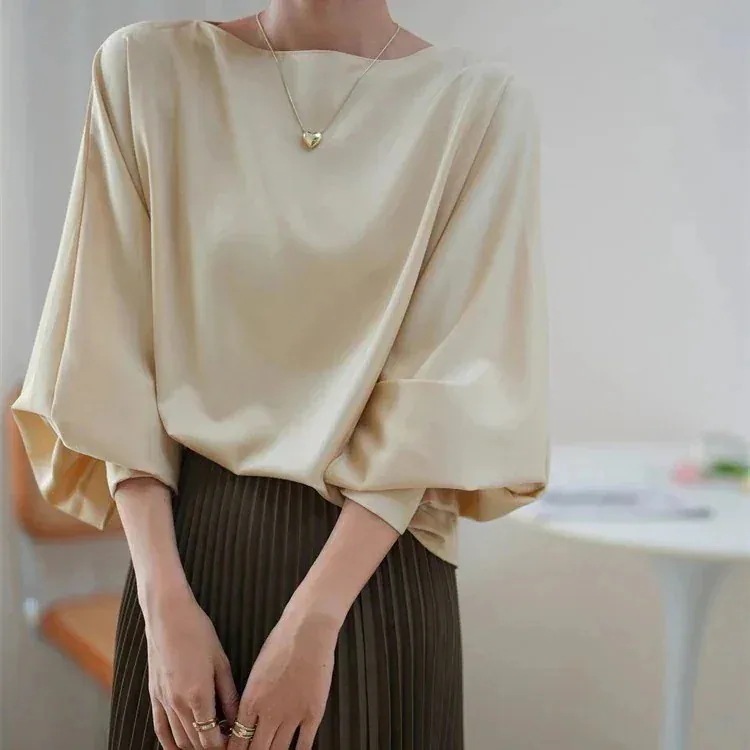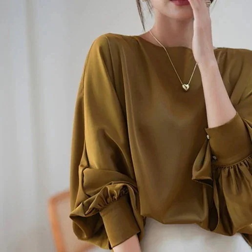 韓国ファッション シャツ トップルーズラウンドネックソリッドカラー長袖シャツブラウス レディース気質