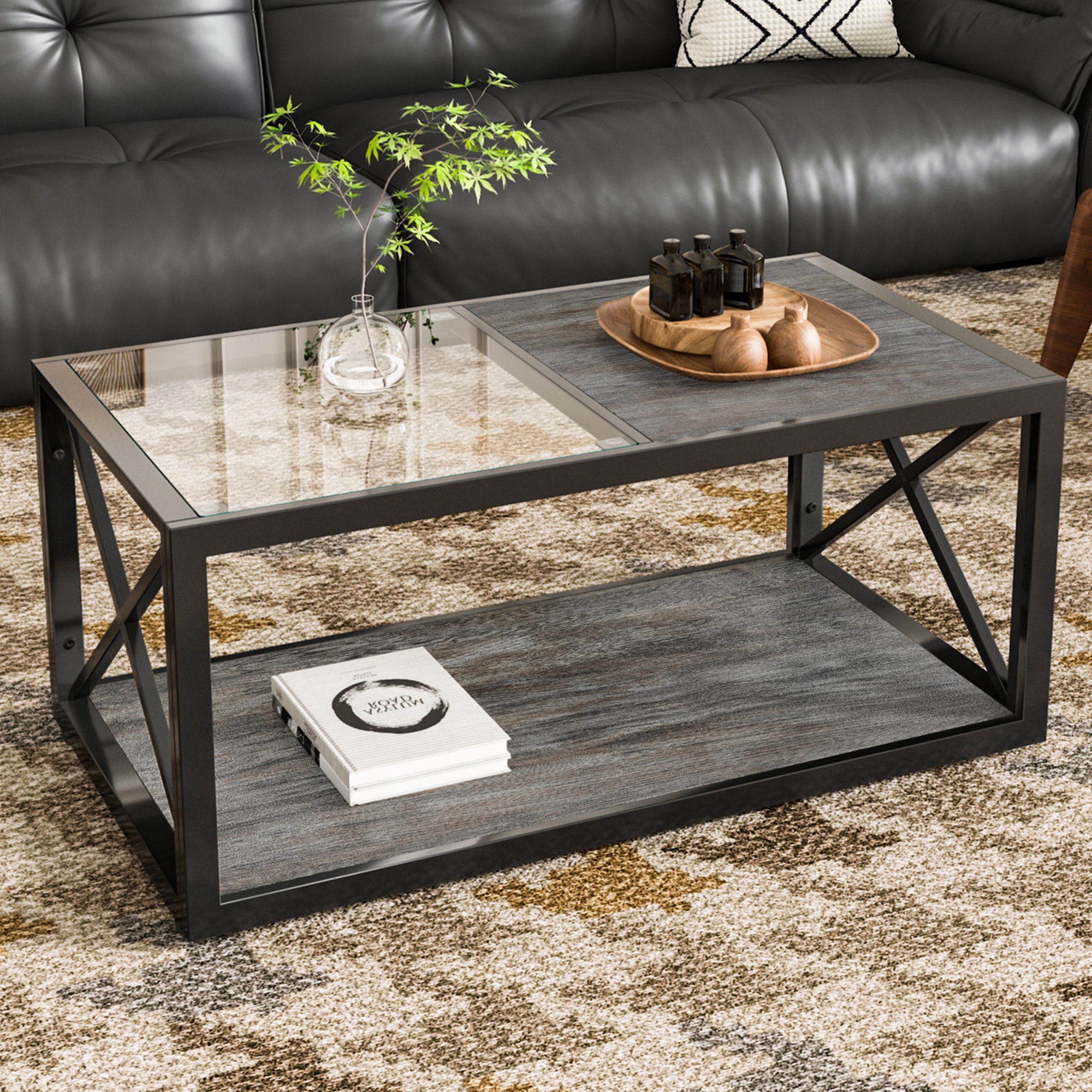 509長方形コーヒーテーブル リビング用 強化ガラス天板×ウッド調MDF インダストリアルスタイル ローテーブル