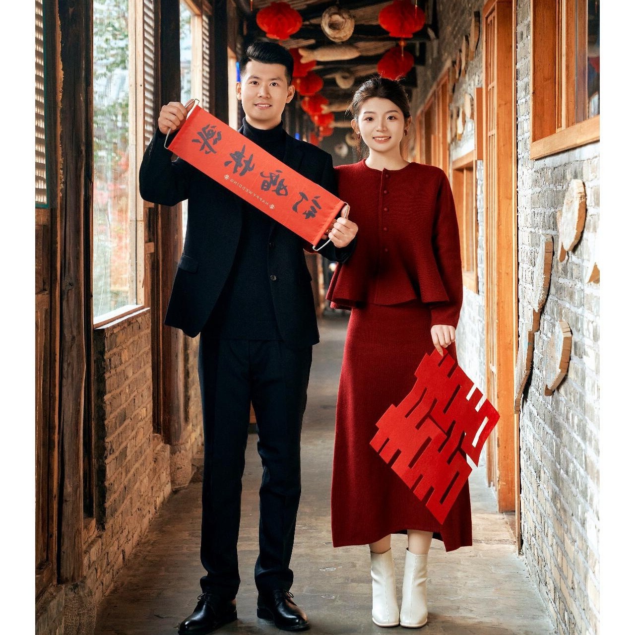 花嫁の実家に帰って乾杯ブライダルエンゲージ衣装お正月衣装赤いセーターとカーディガン今年流行の美しいツーピースのスカートスーツ