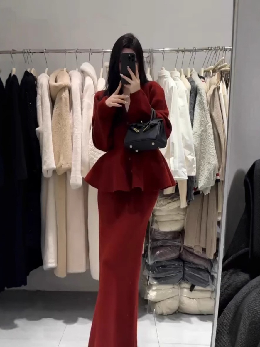高級韓国風トップス大人カジュアルファッショナブルでスリム女性用新年の赤いツーピースドレス秋冬