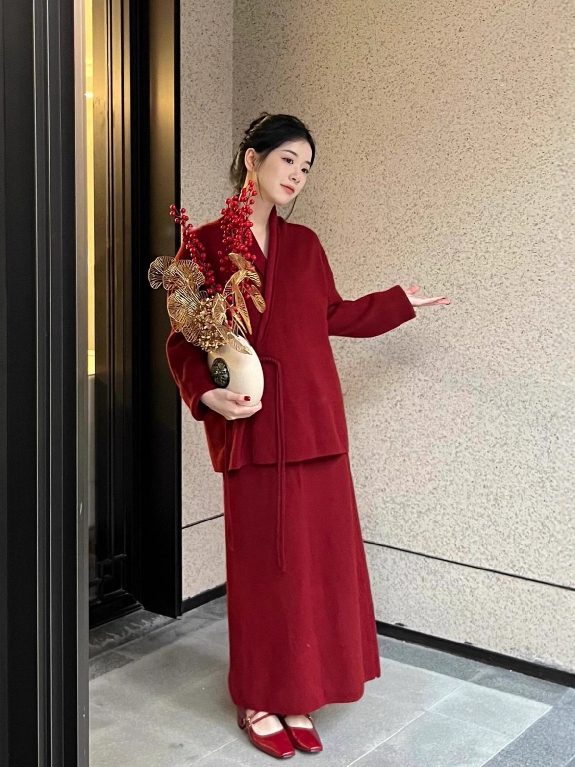 洗練された赤いセーターとスカートのセットが特徴的な真冬向けのモダンな中国風の女性の衣装です