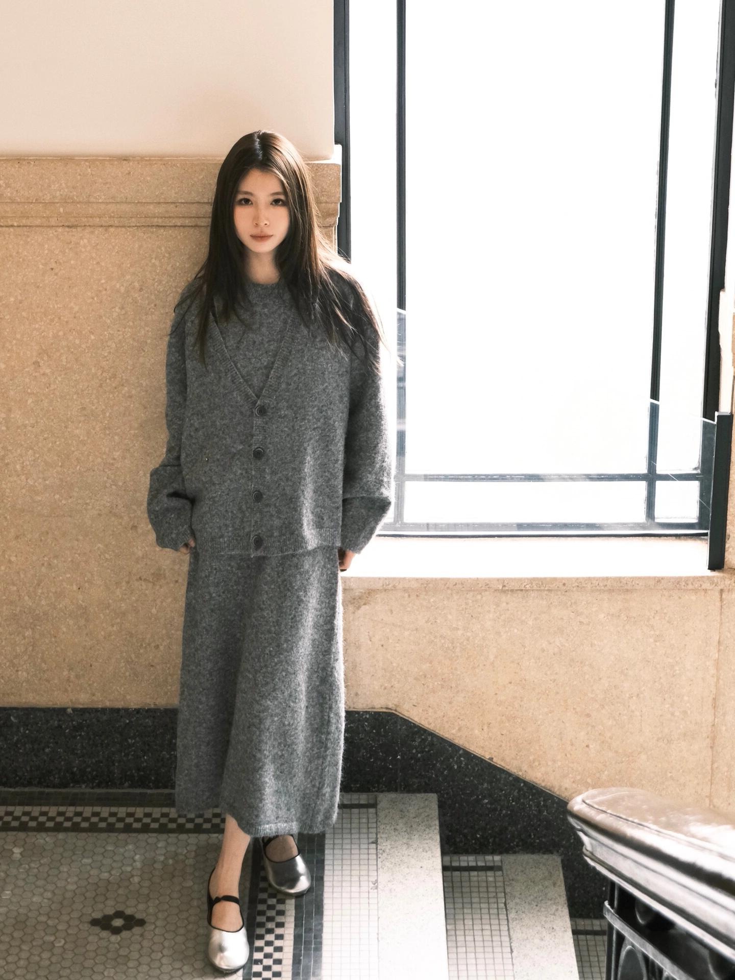 秋冬 アッシュグレー ニットカーディガン ベスト ワンピース ツーピースセット レディース