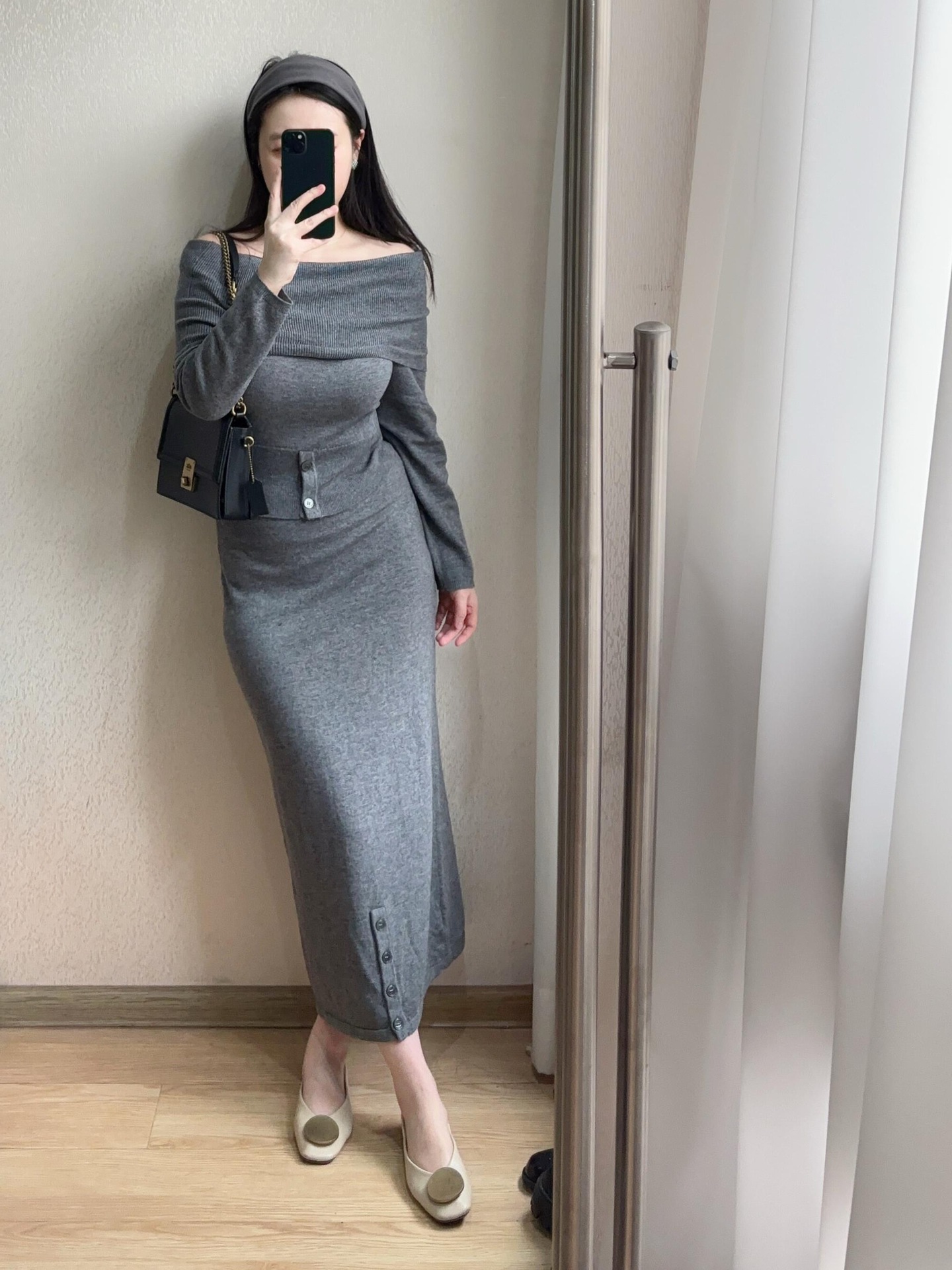 オフショルダーニットトップスとエレガントなボディコンスカートのグレースタイルのユニークで美しいツーピースセット