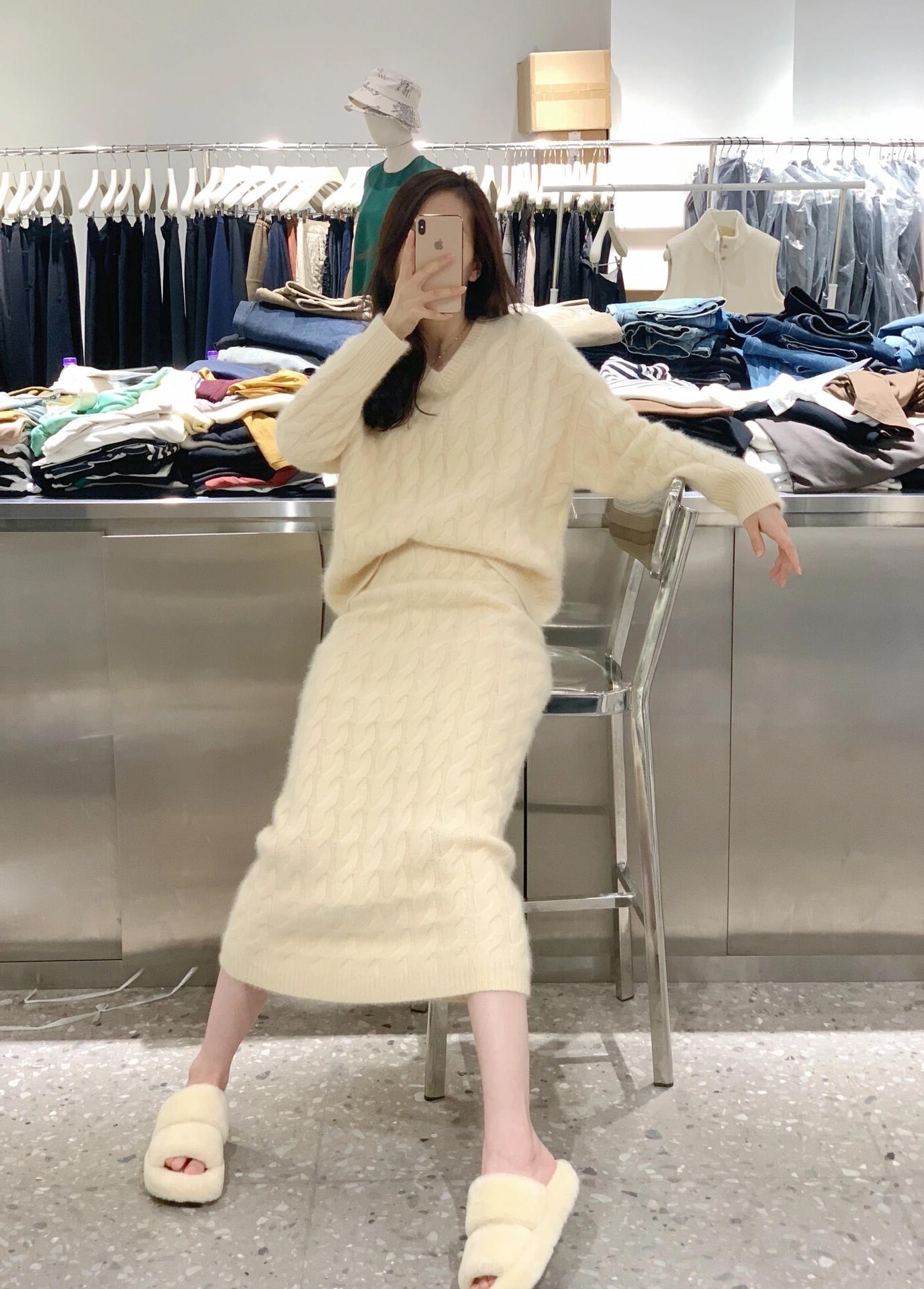 秋冬にぴったりなホワイトのVネックニットトップスとスカートの優しく上品なツーピースセット若々しく可愛らしくそしてスタイリッシュな装いです
